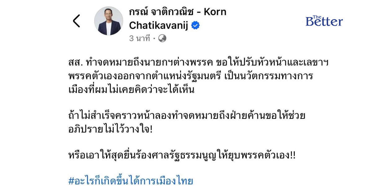 นายกรณ์ จาติกวณิช อดีตหัวหน้าพรรคกล้า อดีตรมว.คลัง โพสต์ข้อความผ่านเฟซบุ๊ก ระบุว่า สส. ทำจดหมายถึงนายกฯต่างพรรค ขอให้ปรับหัวหน้าและเลขาฯพรรคตัวเองออกจากตำแหน่งรัฐมนตรี เป็นนวัตกรรมทางการเมืองที่ผมไม่เคยคิดว่าจะได้เห็น ถ้าไม่สำเร็จคราวหน้าลองทำจดหมายถึงฝ่ายค้านขอให้ช่วยอภิปรายไม่ไว้วางใจ! หรือ เอาให้สุดยื่นร้องศาลรัฐธรรมนูญให้ยุบพรรคตัวเอง!!
