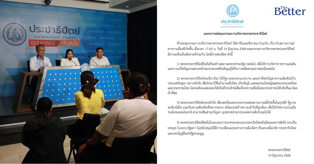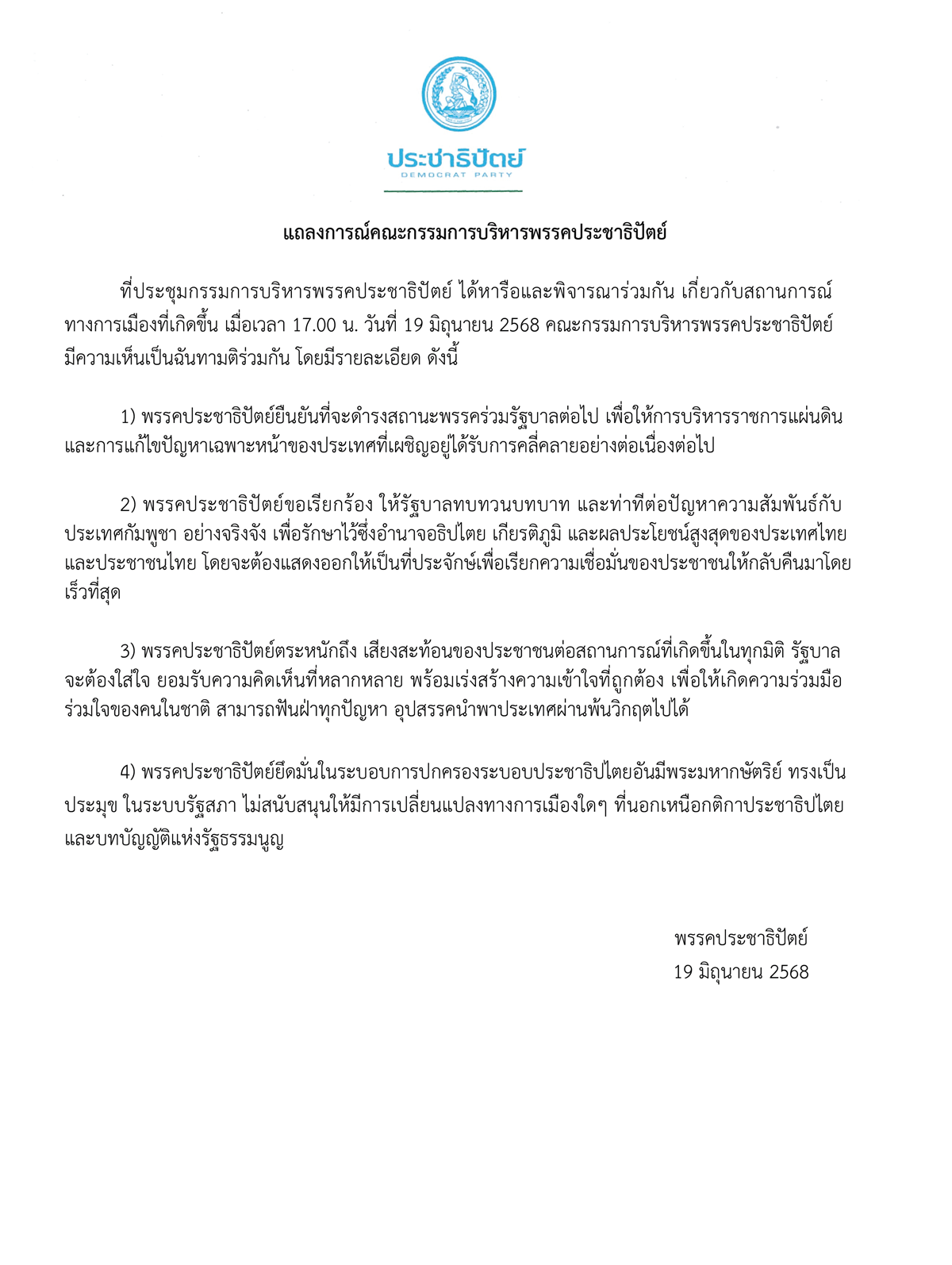 พรรคประชาธิปัตย์ได้ออกแถลงการณ์ภายหลังคณะกรรมการบริหารพรรคประชาธิปัตย์ได้ประชุมร่วมกันเมื่อวันที่ 19 มิ.ย.2568 โดยระบุว่าคณะกรรมการบริหารพรรคประชาธิปัตย์ได้หารือและพิจารณาร่วมกันเกี่ยวกับสถานการณ์ทางการเมืองที่เกิดขึ้น เมื่อเวลา 17.00 น. วันที่ 19 มิ.ย. 2568 มีความเห็นเป็นฉันทามติร่วมกัน โดยมีรายละเอียด ดังนี้ 1) พรรคประชาธิปัตย์ยืนยันที่จะดำรงสถานะพรรคร่วมรัฐบาลต่อไป เพื่อให้การบริหารราชการแผ่นดิน และการแก้ไขปัญหาเฉพาะหน้าของประเทศที่เผชิญอยู่ได้รับการคลี่คลายอย่างต่อเนื่องต่อไป