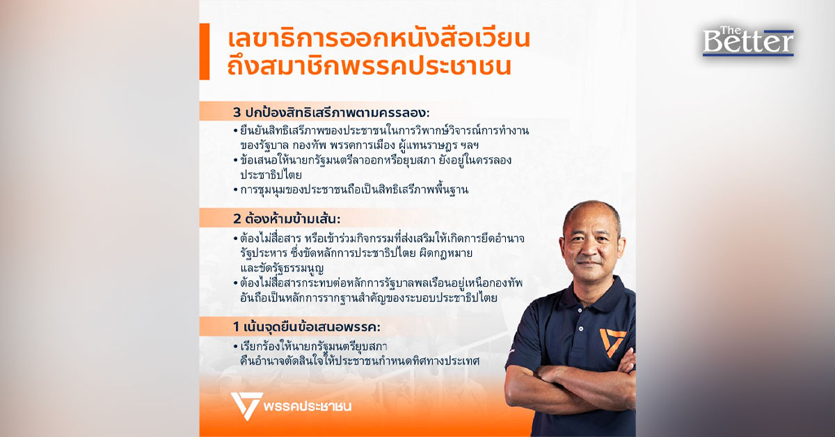 เลขาธิการพรรคประชาชน ออกหนังสือเวียนถึงสมาชิกพรรค แนวปฏิบัติสอดคล้องจุดยืนทางอุดมการณ์-นโยบาย ปกป้องสิทธิเสรีภาพตามครรลองประชาธิปไตย ห้ามข้ามเส้นหนุนรัฐประหาร ย้ำจุดยืนเรียกร้องนายกฯ ยุบสภา