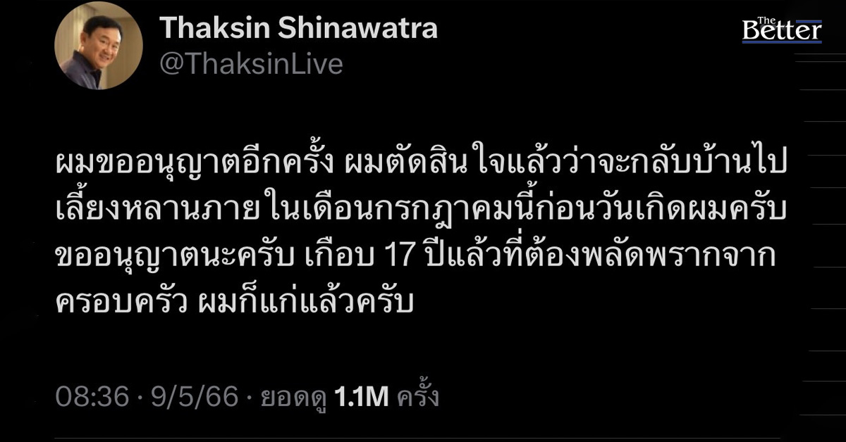 เมื่อวันที่ 9 พ.ค.2566 นายทักษิณ ชินวัตร อดีตนายกรัฐมนตรี ได้ทวิตข้อความระบุว่า ผมขออนุญาตอีกครั้ง ผมตัดสินใจแล้วว่าจะกลับบ้านไปเลี้ยงหลานภายในเดือนกรกฎาคมนี้ก่อนวันเกิดผมครับ ขออนุญาตนะครับ เกือบ 17 ปีแล้วที่ต้องพลัดพรากจากครอบครัว ผมก็แก่แล้วครับ