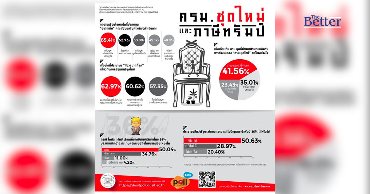 ทั้งนี้เมื่อเทียบกับ ครม.ชุดที่ผ่านมาคิดว่าการทำงานของ ครม.ชุดใหม่อาจจะแย่กว่า ร้อยละ 41.56 ด้านความเห็นเกี่ยวกับกรณีโดนัล ทรัมป์ เรียกเก็บภาษีนำเข้าสินค้าไทย 36% คาดว่าจะกระทบเศรษฐกิจไทยอย่างมาก ร้อยละ 50.04 สุดท้ายมองว่ารัฐบาลไทยไม่น่าจะเจรจาแก้ไขปัญหานี้ได้ ร้อยละ 50.63