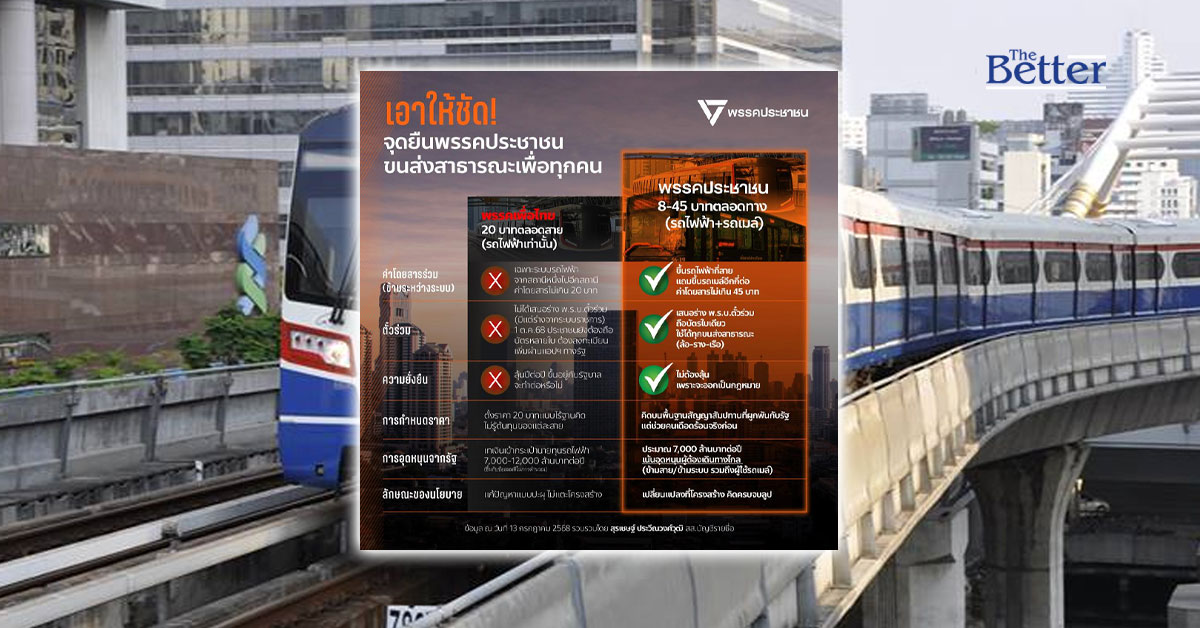 พรรคประชาชนออกแบบนโยบาย “ค่าโดยสารร่วม 8-45 บาท รวมระบบรถไฟฟ้าและระบบรถเมล์” เพื่อแก้ปัญหาที่โครงสร้าง คิดครบรอบด้านเพื่อประโยชน์ของผู้โดยสารทุกกลุ่มภายใต้แนวคิด #ขนส่งสาธารณะเพื่อทุกคน โดยจัดสรรทรัพยากรที่มีอยู่จำกัดเพื่อช่วยคนที่เดือดร้อนจริงๆ มากหน่อย ไม่ใช่แก้ปัญหาเฉพาะหน้าแบบปะผุ โปรยไปทั่วให้เหลือ 20 บาท แต่แท้จริงคือการประเคนผลประโยชน์ให้นายทุนรถไฟฟ้า ที่มีความสนิทสนมกับนายใหญ่ในรัฐบาล