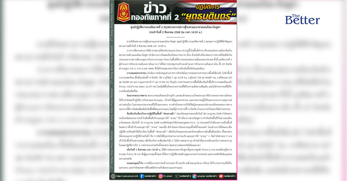 จากสถานการณ์ความตึงเครียดตามแนวชายแดนไทย-กัมพูชา ศูนย์ปฏิบัติการกองทัพภาคที่ 2 ได้รายงานภาพรวมสถานการณ์ล่าสุดถึงเวลา 14.00 น. ของวันที่ 2 สิงหาคม 2568 ดังนี้