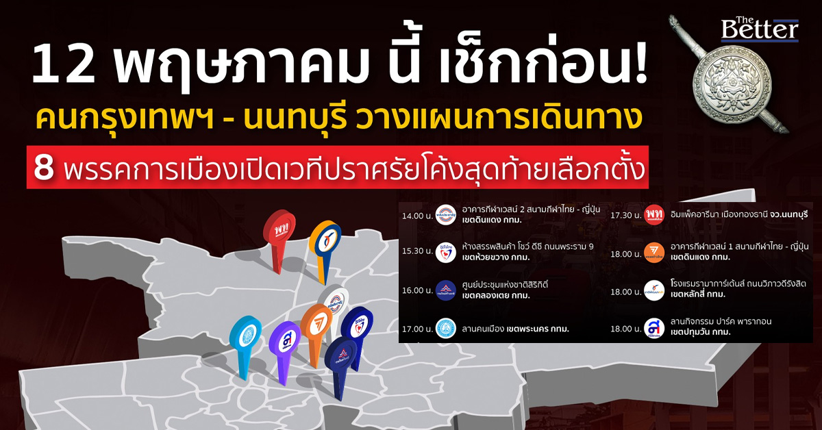 และ 8. พรรคไทยสร้างไทย ปราศรัยที่ ลานกิจกรรม ปาร์ค พารากอน เขตปทุมวัน กทม.ในเวลา 18.00 น.
