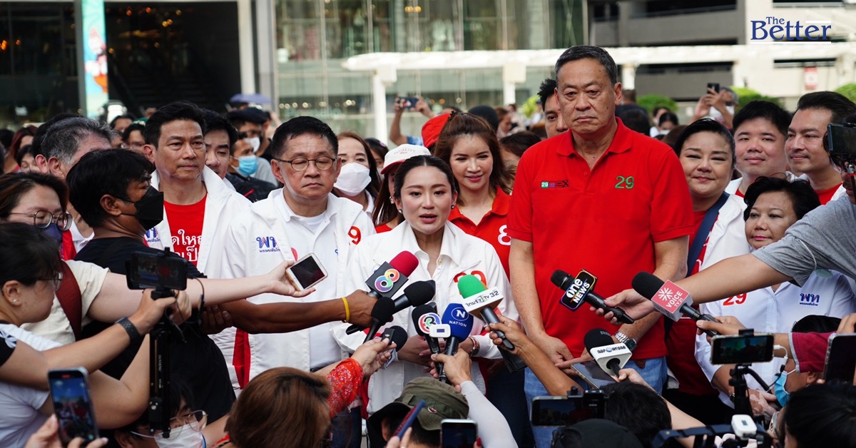 ที่สยามพารากอน น.ส.แพทองธาร ชินวัตร และ นายเศรษฐา ทวีสิน แคนดิเดตนายกฯ พรรคเพื่อไทย ให้สัมภาษณ์ หลังขึ้นรถแห่หาเสียงในพื้นที่กรุงเทพโดยได้เชิญชวนคนรุ่นใหม่ หรือ first voter ให้เปิดใจกับพรรคเพื่อไทยเพราะมีประวัติยาวนานกว่า 20 ปี ยอมรับว่าอาจถูกมองในหลายมิติทั้งเรื่องความเก่า หรือบางคนมองว่าสามารถปรับตัวได้ดีขึ้น แต่อยากให้เห็นถึงความสำเร็จของนโยบายแล้วพิจารณาแบบไม่มีอคติ กับพรรคการเมืองใดๆ นโยบายไหนถูกใจหรือตอบโจทย์ที่จะทำให้ประเทศไปข้างหน้า เป็นกำลังใจให้คนรุ่นใหม่ใช้สิทธิ์ใช้เสียงอย่างเต็มศักยภาพให้ภาคภูมิใจที่สุด จำได้ว่าตนใช้สิทธิ์ครั้งแรก ก็รู้สึกภูมิใจ เพราะเป็นการเชียร์คุณพ่อ (ทักษิณ ชินวัตร) แต่ครั้งนี้เป็นการเลือกตั้งในขณะที่เป็นแคนดิเดตนายกรัฐมนตรีด้วย ทำให้รู้สึกอินกว่าเดิม เพราะได้มีส่วนร่วมกับส่วนต่างๆ จึงอยากให้ทุกคนออกมาใช้สิทธิ์กันเยอะเยอะ