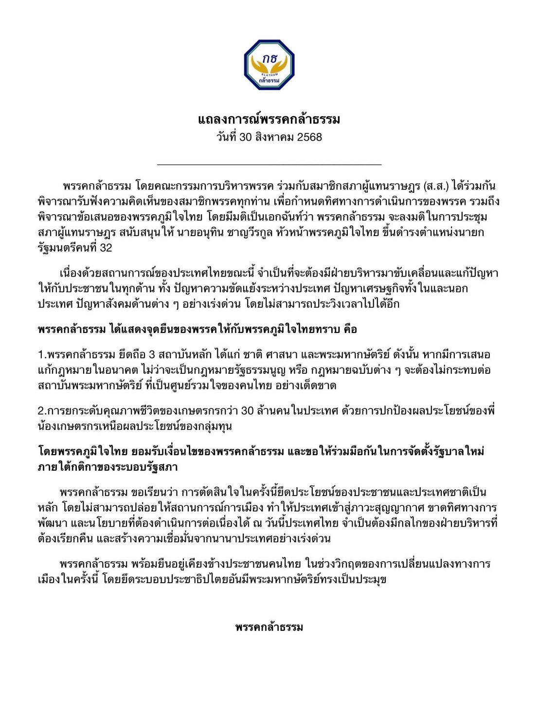 พรรคกล้าธรรม(กธ.)ได้ออกแถลงการณ์ภายหลัง น.ส.แพทองธาร ชินวัตร พ้นจากความเป็นนายกรัฐมนตรีด้วยมติตุลาการศาลรัฐธรรมนูญ เสียงข้างมาก ซึ่งทำให้คณะรัฐมนตรีต้องพ้นจากตำแหน่งทั้งคณะ และจะต้องมีการโหวตเลือกนายกรัฐมนตรี คนที่ 32 ต่อไปว่า