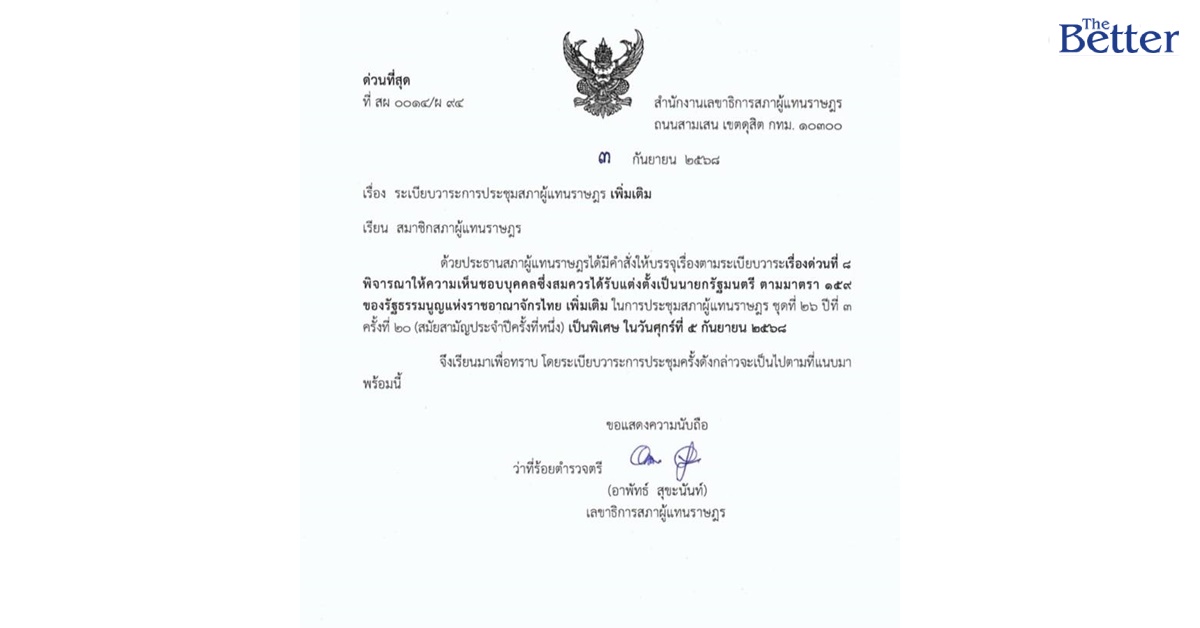 ต่อมาเวลา 21.00 น. ผู้สื่อข่าวรายงานว่า เว็บไซต์ สำนักงานเลขาธิการสภาผู้แทนราษฎร ได้เผยแพร่วาระการประชุมสภาผู้แทนราษฎร ในวันที่ 5 ก.ย.2568 โดยมีวาระเรื่องด่วนที่ 8 พิจารณาให้ความเห็นชอบบุคคลซึ่งสมควรได้รับแต่งตั้งเป็นนายกรัฐมนตรี ตามมาตรา 159 ของรัฐธรรมนูญแห่งราชอาณาจักรไทย
