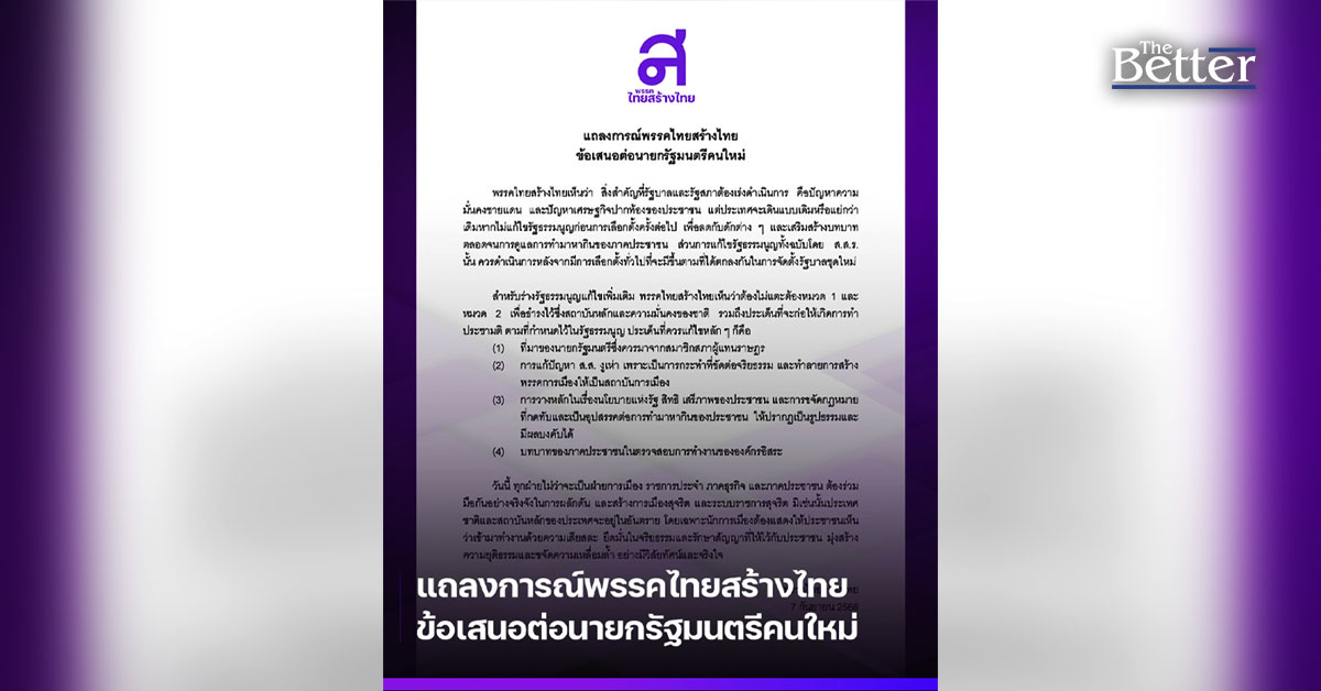 พรรคไทยสร้างไทย แถลงการณ์พรรคไทยสร้างไทย ข้อเสนอต่อนายกรัฐมนตรีคนใหม่