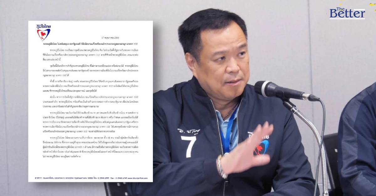 ‘ภูมิใจไทย’ ออกแถลงการณ์ไม่สนับสนุนนายก-พรรค ที่มีนโยบายแก้ไขหรือยกเลิก ม.112