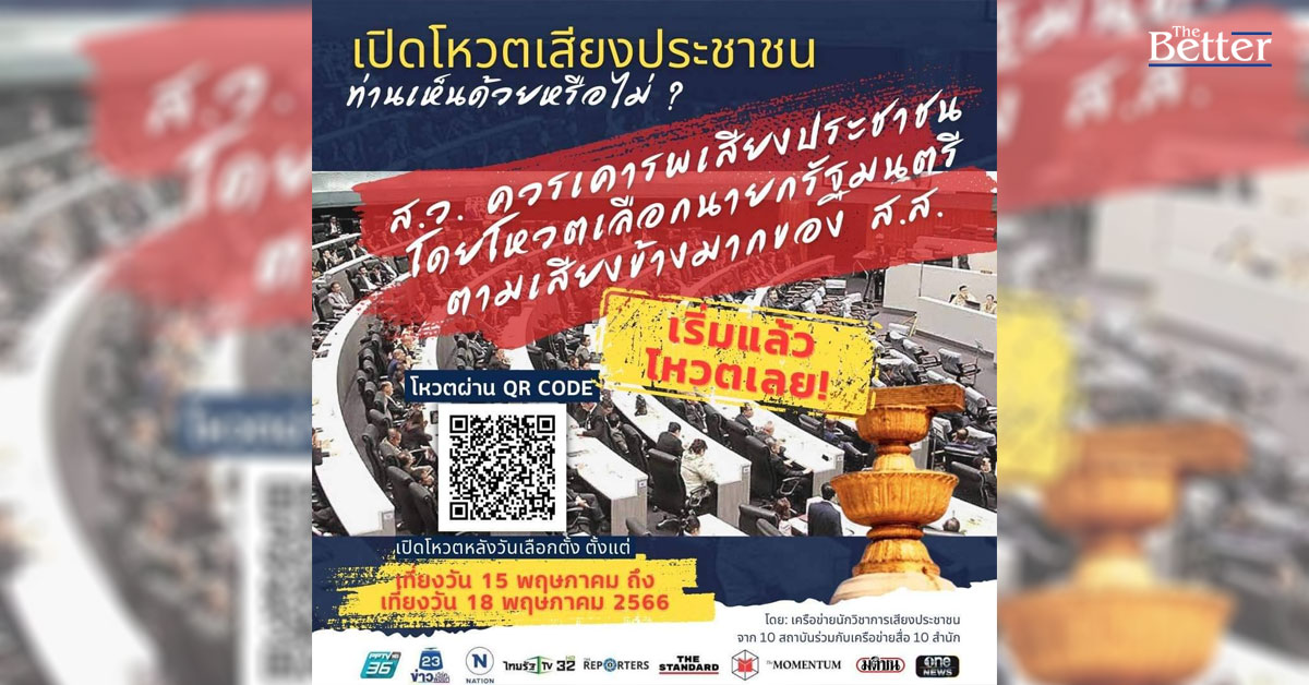 วันที่ 18 พ.ค. 2566 "เครือข่ายนักวิชาการเสียงประชาชน" แถลงผลการโหวตเสียงประชาชน และข้อเสนอแนะต่อการจัดตั้งรัฐบาลและการเลือกนายกรัฐมนตรี ตามที่เครือข่ายนักวิชาการเสียงประชาชนจาก 10 มหาวิทยาลัย ได้ร่วมกับสื่อมวลชน 10 สำนัก เปิดโหวต "เสียงประชาชน" มาตั้งแต่วันที่ 15 พฤษภาคม เครือข่ายนักวิชาการเสียงประชาชนจึงขอแถลงผลการโหวต พร้อมกับข้อเสนอแนะต่อการจัดตั้งรัฐบาลและการเลือกนายกรัฐมนตรีตามระบอบประชาธิปไตยในระบบรัฐสภา ดังต่อไปนี้