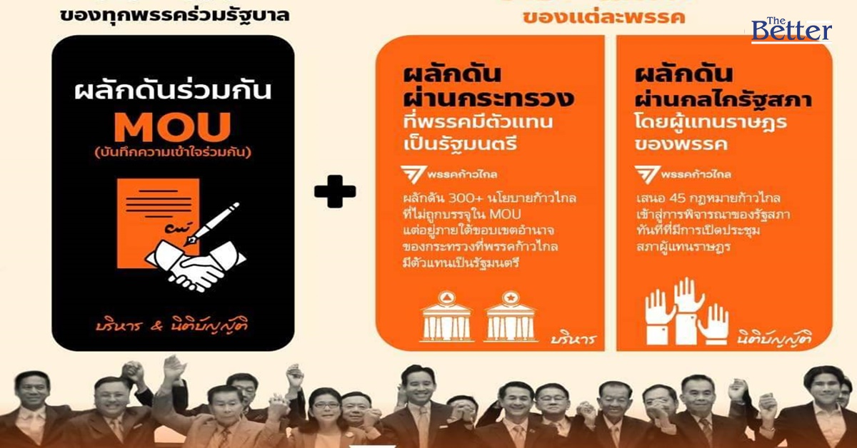 - เช่น กฎหมาย 45 ฉบับที่พรรคพร้อมเสนอสู่สภาทันทีที่สภาเปิด ไม่ว่าจะปรากฎอยู่ใน MOU หรือไม่