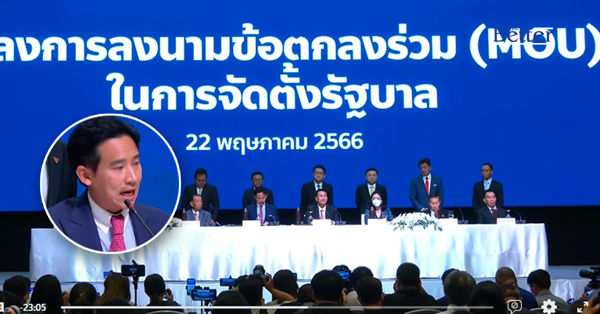 วันที่ 22 พ.ค. 2566 นายพิธา ลิ้มเจริญรัตน์ หัวหน้าพรรคก้าวไกล, นายแพทย์ชลน่าน ศรีแก้ว หัวหน้าพรรคเพื่อไทย, คุณหญิงสุดารัตน์ เกยุราพันธุ์ หัวหน้าพรรคไทยสร้างไทย, นายวันมูหะมัดนอร์ มะทา หัวหน้าพรรคประชาชาติ, พล.ต.อ.เสรีพิศุทธ์ เตมียเวส หัวหน้าพรรคเสรีรวมไทย, นายปิติพงศ์ เต็มเจริญ หัวหน้าพรรคเป็นธรรม, นายเชาวฤทธิ์ ขจรพงศ์กีรติ หัวหน้าพรรคพลังสังคมใหม่ และนายวสวรรธน์ พวงพรศรี หัวหน้าพรรคเพื่อไทรวมพลัง ร่วมแถลงข่าวบันทึกข้อตกลงร่วม (MOU จัดตั้งรัฐบาล)
