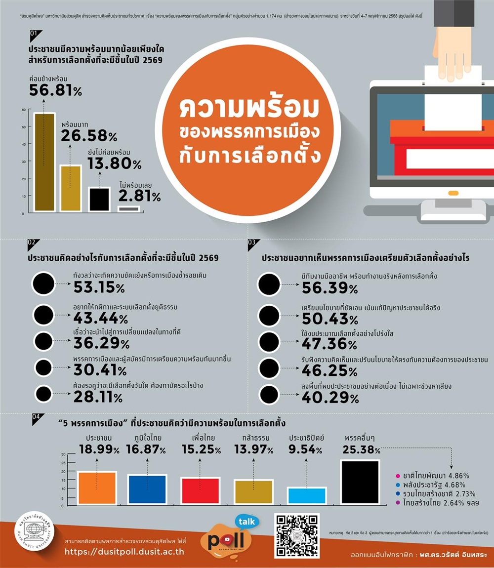 “สวนดุสิตโพล” มหาวิทยาลัยสวนดุสิต สำรวจความคิดเห็นประชาชนทั่วประเทศ เรื่อง “ความพร้อมของพรรคการเมืองกับการเลือกตั้ง” กลุ่มตัวอย่าง จำนวน 1,174 คน (สำรวจทางออนไลน์และภาคสนาม) ระหว่างวันที่ 4-7 พ.ย. 2568 พบว่า กลุ่มตัวอย่างค่อนข้างพร้อมสำหรับการเลือกตั้งที่จะมีขึ้นในปี2569 ร้อยละ 56.81 โดยมองว่าการเลือกตั้งใหญ่ ที่จะมีขึ้นอาจจะเกิดความขัดแย้งหรือการเมืองซ้ำรอยเดิม ร้อยละ 53.15 ทั้งนี้ อยากเห็นพรรคการเมืองเตรียมทีมงานมืออาชีพ พร้อมทำงานจริงหลังการเลือกตั้ง ร้อยละ 56.39 โดยพรรคการเมืองที่มองว่ามีความพร้อมรับศึกเลือกตั้งมากที่สุด คือ พรรคประชาชน ร้อยละ 18.99 รองลงมาคือ ภูมิใจไทย ร้อยละ 16.87 และเพื่อไทย ร้อยละ 15.25