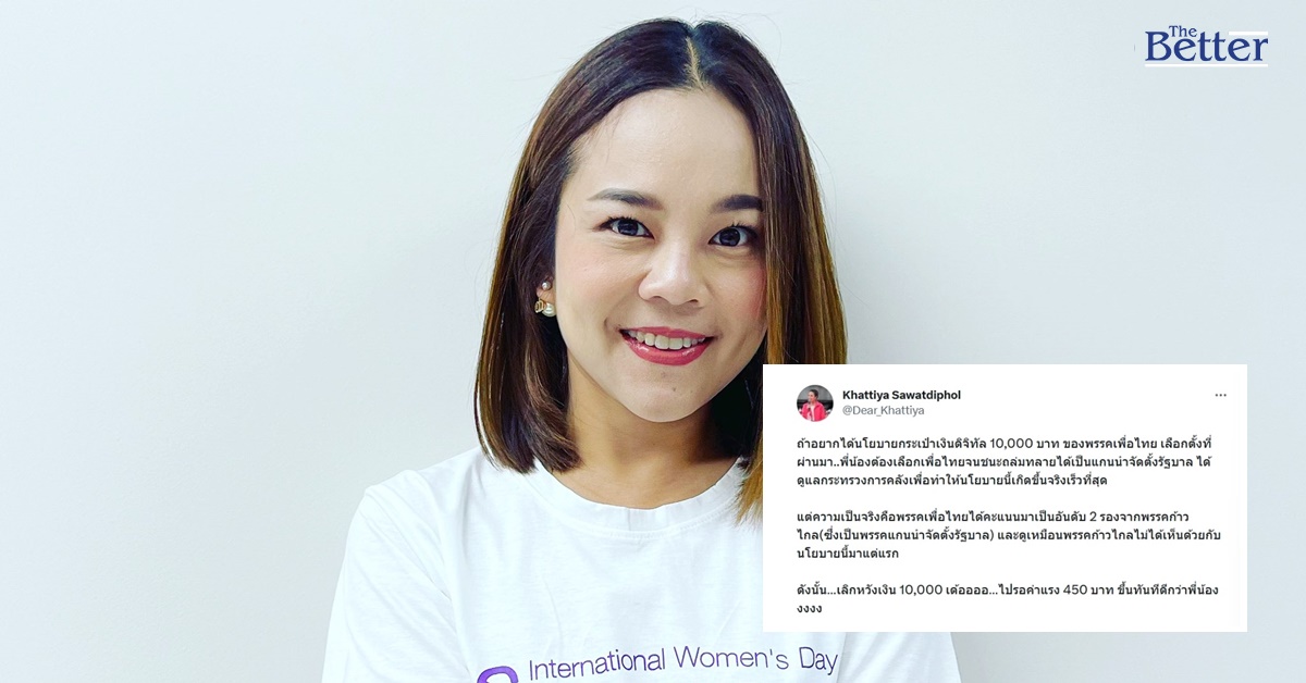 "เดียร์ ขัตติยา" ว่าที่ ส.ส.เพื่อไทย โพสต์ เลิกหวังเงินดิจิทัล 10,000 ไปรอค่าแรง 450 บาท เอา หลังพรรคเพื่อไทยได้คะแนนเป็นอันดับ 2