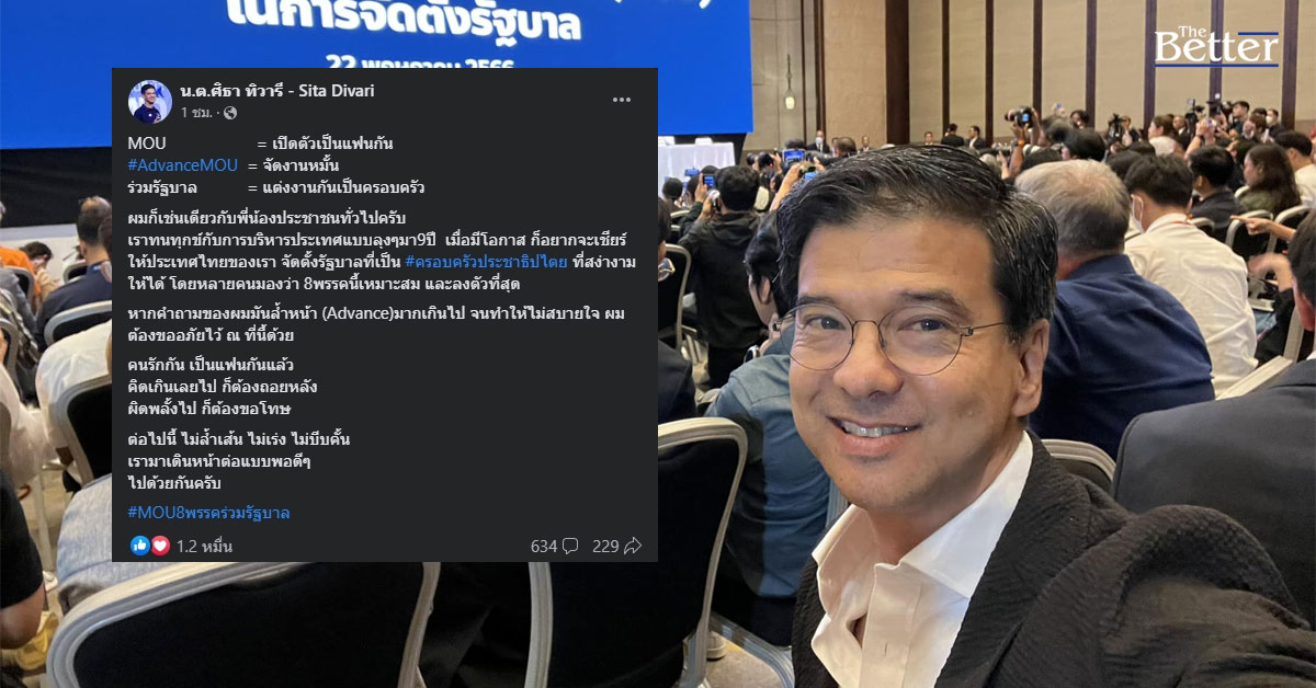 วันที่ 24 พ.ค.2566 "น.ต.ศิธา ทิวารี" ได้โพสต์ผ่านเฟซบุ๊ก ส่วนตัว น.ต.ศิธา ทิวารี - Sita Divari ชี้ให้เห็นถึงประเด็นเรื่องการทำ MOU กับพรรคที่ร่วมกันจัดตั้งรัฐบาล เปรียบเทียบให้เห็นภาพง่ายๆ เหมือนคู่รัก ตั้งแต่เปิดตัวเป็นแฟนกันจนถึงแต่งงาและเป็นครอบครัวเดียวกัน โดยในโพสต์ระบุว่า