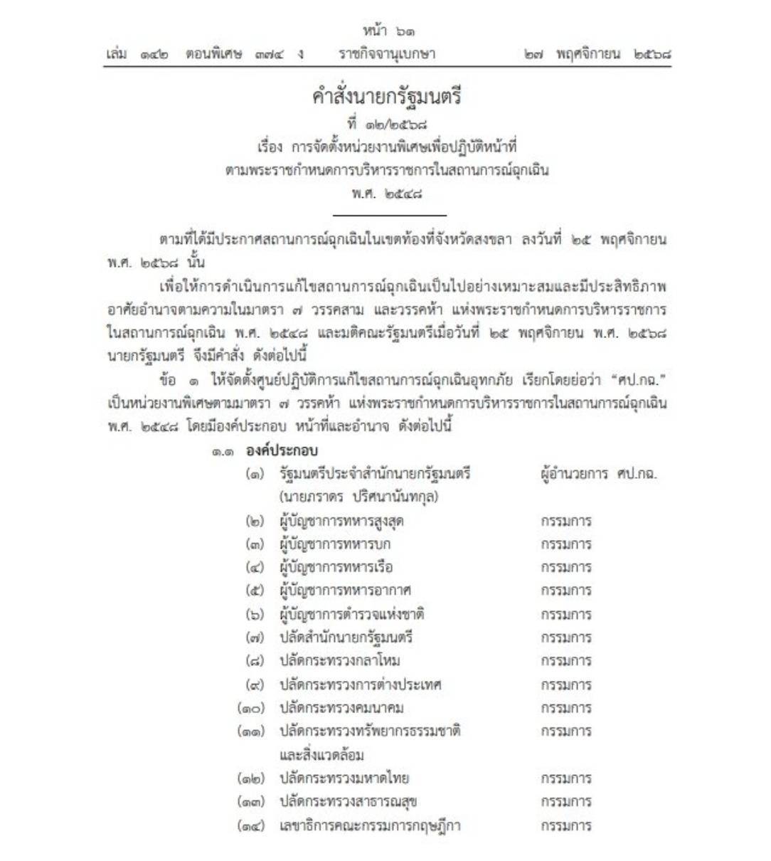 เว็บไซต์ ราชกิจจานุเบกษา เผยแพร่ คำสั่งนายกรัฐมนตรี ที่ 12/2568 เรื่อง การจัดตั้งหน่วยงานพิเศษเพื่อปฏิบัติหน้าที่ตามพระราชกำหนดการบริหารราชการในสถานการณ์ฉุกเฉิน พ.ศ. 2548 ระบุว่า ตามที่ได้มีประกาศสถานการณ์ฉุกเฉินในเขตท้องที่ จังหวัดสงขลา ลงวันที่ 25 พฤศจิกายน พ.ศ. 2568 นั้น เพื่อให้การดำเนินการแก้ไขสถานการณ์ฉุกเฉินเป็นไปอย่างเหมาะสมและมีประสิทธิภาพ อาศัยอำนาจตามความในมาตรา 7 วรรคสาม และวรรคห้า แห่งพระราชกำหนดการบริหารราชการในสถานการณ์ฉุกเฉิน พ.ศ. 2548 และมติคณะรัฐมนตรีเมื่อวันที่ 25 พฤศจิกายน พ.ศ. 2568 นายกรัฐมนตรี จึงมีคำสั่ง ดังต่อไปนี้