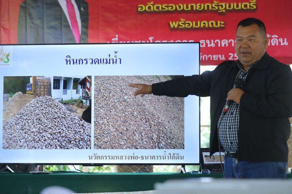 ขณะที่นายเร่งรัด กล่าวว่า ประเทศไทยน้ำท่วม และน้ำแล้งเป็นวัฏจักรทุกปี เพราะมีปริมาณฝนตก 736,802 ล้านลูกบาศก์เมตรต่อปี แต่สามารถเก็บได้เพียง 97,140 ล้านลูกบาศก์เมตรต่อปี คิดเป็น 12% เท่านั้น จึงจะเห็นว่า เราขาดภาชนะเก็บน้ำ ดังนั้น การทำธนาคารน้ำใต้ดินจะช่วยกักเก็บน้ำหน้าฝนให้ได้มากที่สุด และนำน้ำมาใช้ในหน้าแล้งได้ ด้วยหลักการธนาคารน้ำใต้ดิน 2 ระบบ คือ ระบบปิด และระบบเปิด ซึ่งระบบปิดคือ การเติมน้ำลงใต้ดินในชั้นตื้น 3-5 เมตร ด้วยการขุดหลุม เช่น 2x2x2 เมตร โดยเทหินกรวดแม่น้ำลงไป เพื่อดูดซึมน้ำเก็บไว้ ส่วนระบบเปิด คือ การขุดดินให้พ้นชั้นดินเหนียว จนถึงชั้นหินอุ้มน้ำ ซึ่งมีความลึกประมาณ 7-8 เมตร จะทำให้น้ำซึมลงไปเก็บชั้นดาบาลได้ ซึ่งหลักการทำธนาคารน้ำใต้ดิน ต้องทำทั้ง 2 ระบบ จึงจะส่งผลได้อย่างชัดเจน และถ้ามีการไปทำในป่า น้ำจะซับลงดิน จะช่วยป้องกันปัญหาน้ำป่าไหลหลากได้