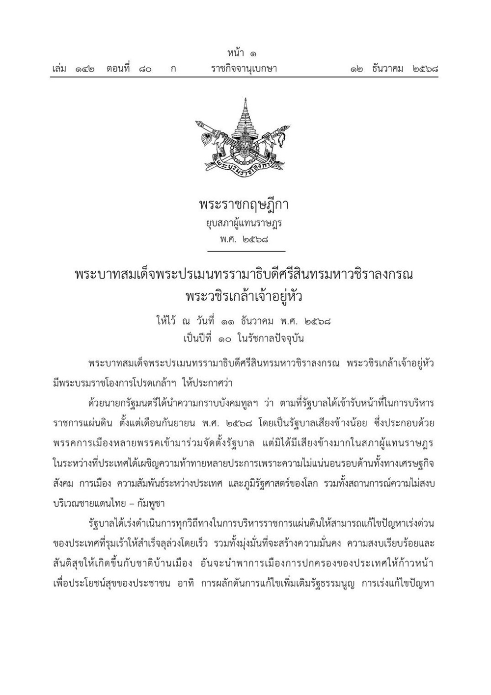 ด้วยนายกรัฐมนตรีได้นำความกราบบังคมทูลฯ ว่า ตามที่รัฐบาลได้เข้ารับหน้าที่ในการบริหารราชการแผ่นดิน ตั้งแต่เดือนกันยายน พ.ศ. 2568 โดยเป็นรัฐบาลเสียงข้างน้อย ซึ่งประกอบด้วยพรรคการเมืองหลายพรรคเข้ามาร่วมจัดตั้งรัฐบาล