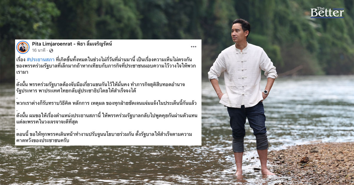 นายพิธา ลิ้มเจริญรัตน์ แคนดิเดตนายกรัฐมนตรีจากพรรคก้าวไกล โพสต์เฟซบุ๊ก ระบุ เรื่อง #ประธานสภา ที่เกิดขึ้นทั้งหมดในช่วงไม่กี่วันที่ผ่านมานี้ เป็นเรื่องความเห็นไม่ตรงกันของพรรคร่วมรัฐบาลที่เล็กมากถ้าหากเทียบกับภารกิจที่ประชาชนมอบความไว้วางใจให้พวกเรามา