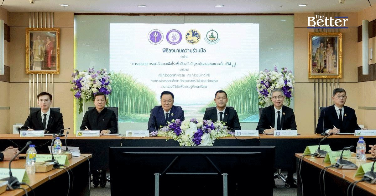 ดังนั้นกระทรวงอุตสาหกรรม จึงได้มอบหมายให้สำนักงานคณะกรรมอ้อยและน้ำตาลทราย (สอน.) เดินหน้าขับเคลื่อนมาตรการเพิ่มอ้อยตัดสดลดการเผา สะท้อนให้เห็นถึงความร่วมมือจากทั้งเกษตรกร โรงงานน้ำตาล และหน่วยงานทุกภาคส่วน โดยได้ยกระดับความร่วมมือกับหน่วยงานภาครัฐหลักอย่างต่อเนื่อง โดยเฉพาะอย่างยิ่ง กระทรวงอุตสาหกรรมจึงร่วมกับ 4 กระทรวงหลัก ซึ่งเป็นที่มาของลงนามความร่วมมือว่าด้วยการควบคุมการเผาอ้อยและพืชไร่ เพื่อป้องกันปัญหาฝุ่นละอองขนาดเล็ก (PM 2.5) ในวันนี้ มีเป้าหมายเพื่อบูรณาการความร่วมมือระหว่างหน่วยงานภาครัฐในการแก้ไขปัญหาการเผาอ้อยในช่วงฤดูการผลิตปี 2568/2569 ถึงฤดูการผลิตปี 2569/2570 โดยให้ความสำคัญกับการลดการเผาอ้อยทั้งก่อนและหลังการเก็บเกี่ยว ควบคู่กับการลดผลกระทบจากฝุ่น PM 2.5 ผ่านการแลกเปลี่ยนองค์ความรู้ ความเชี่ยวชาญ เทคโนโลยี และเครือข่ายการปฏิบัติงานของแต่ละหน่วยงาน เพื่อให้เกิดผลลัพธ์และต่อยอดในระยะยาว ทั้งด้านเศรษฐกิจ สังคม และสิ่งแวดล้อม.jpg)