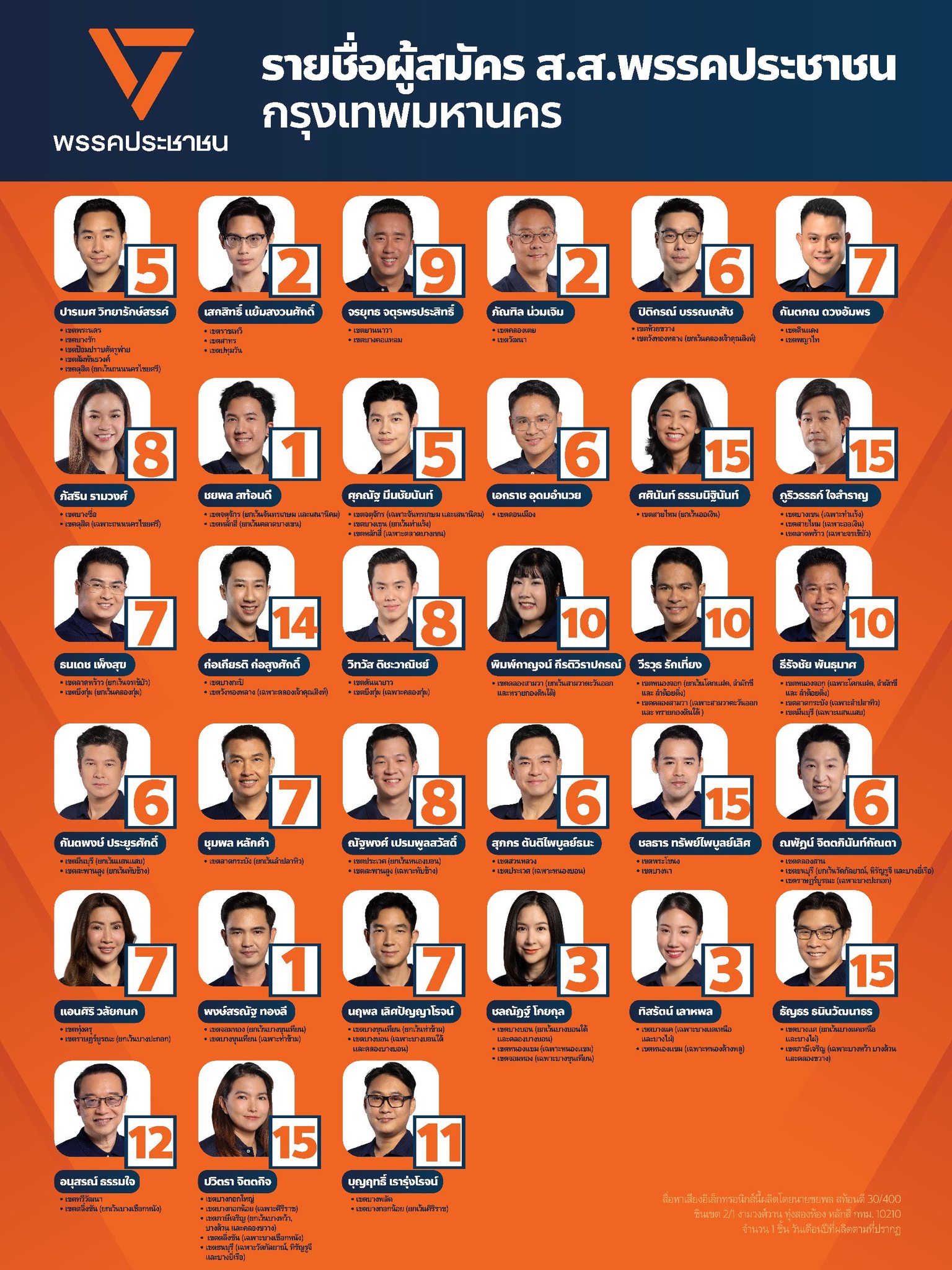 พรรคประชาชน (ปชน.) ประกาศรายชื่อพร้อมหมายเลขผู้สมัครทั้ง 33 เขต กทม.เพื่อเตรียมความพร้อมเดินหน้าหาเสียง ดังนี้