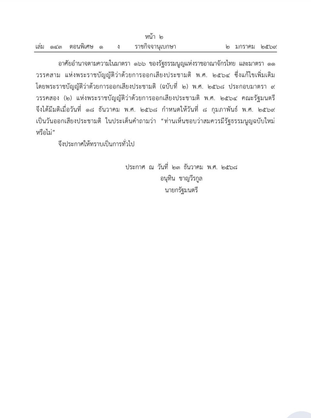 เว็บไซต์ราชกิจจานุเบกษาได้เผยแพร่ประกาศสำนักนายกรัฐมนตรี เรื่อง กำหนดวันออกเสียงประชามติ ซึ่งลงนามโดยนายอนุทิน ชาญวีรกูล นายกรัฐมนตรี และมีเนื้อหาสาระสำคัญเป็นการกำหนดให้วันอาทิตย์ที่ 8 กุมภาพันธ์ 2569 เป็นวันออกเสียงประชามติ พร้อมระบุเหตุผลของการกำหนดให้ออกเสียงประชามติว่าคณะรัฐมนตรีได้แถลงนโยบายต่อรัฐสภาว่า จะสนับสนุนการจัดทำประชามติและการแก้ไขเพิ่มเติม รัฐธรรมนูญโดยรับฟังเสียงของพี่น้องประชาชน และสร้างการมีส่วนร่วมจากทุกภาคส่วนเพื่อให้สอดคล้อง กับคำวินิจฉัยศาลรัฐธรรมนูญที่ 18/2568 ลงวันที่ 10 กันยายน พ.ศ. 2568 คณะรัฐมนตรี จึงเห็นสมควรสนับสนุนการทำประชามติดังกล่าวเพื่อให้เป็นไปตามเจตนารมณ์ของรัฐธรรมนูญ รวมทั้ง เห็นว่ามีเหตุอันสมควรที่จะให้มีการออกเสียงประชามติครั้งที่หนึ่งเพื่อให้ความเห็นชอบการจัดทำ รัฐธรรมนูญฉบับใหม่ ตามมาตรา 9 วรรคสอง (2) แห่งพระราชบัญญัติว่าด้วยการออกเสียงประชามติ พ.ศ.2564