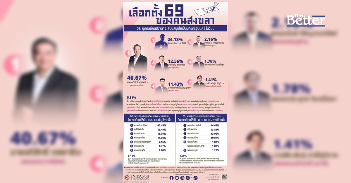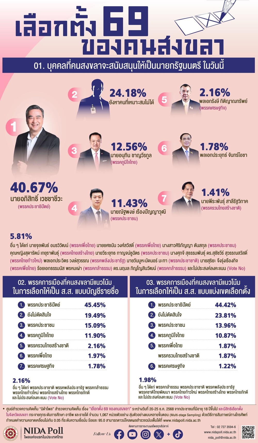 นิด้าโพล เผย เลือกตั้ง 69 คนสงขลา เลือก "อภิสิทธิ์-ปชป."นำอันดับ1 ตามด้วย "อนุทิน-ณัฐพงษ์" ส่วนพรรคการเมือง "ปชน."นำ"ภูมิใจไทย"