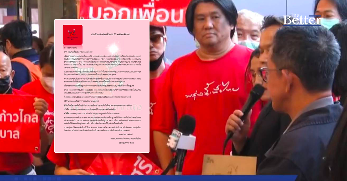 วันที่ 28 พ.ค.2566 ตัวแทนกลุ่มคนเสื้อแดง FC พรรคเพื่อไทย ได้ยื่นหนังสือเรียกร้องให้พรรคเพื่อไทยถอนตัวจากการร่วมรัฐบาล โดยมี นายอนุสรณ์ เอี่ยมสะอาด รองเลขานุการคณะกรรมการยุทธศาสตร์และทิศทางการเมือง พรรคเพื่อไทย มารับหนังสือ ซึ่งมีเนื้อหาระบุว่า เนื่องจากพวกเรากลุ่มคนเสื้อแดง FC พรรคเพื่อไทย มีความเห็นว่าก่อนการเลือกตั้งพรรคเพื่อไทยถูกโจมตีด้วยข้อมูลเท็จจากกลุ่มพรรคการเมือง และ FC บางพรรคต่อเนื่องมาถึงหลังเลือกตั้ง ทางกลุ่มเห็นว่าพวกเราควรมาให้กำลังใจพรรคเพื่อไทย เพื่อให้พรรคได้รับทราบว่ายังมีผู้สนับสนุน 10 ล้านกว่าเสียงจากการเลือกตั้งครั้งนี้ ที่ยังให้การสนับสนุนพรรคเพื่อไทยในการขับเคลื่อนงานทางการเมืองเพื่อประชาชนสืบต่อไป