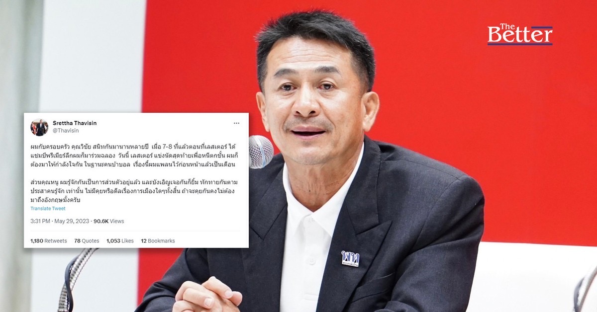 ด้านนายเศรษฐา ทวีสิน แคนดิเดตนายกรัฐมนตรี พรรคเพื่อไทย โพสต์ข้อความผ่านทวิตเตอร์ ชี้แจงหลังมีภาพปรากฎกับ นายอนุทิน ชาญวีรกูล หัวหน้าพรรคภูมิใจไทย ไปร่วมรับชมการแข่งฟุตบอลพรีเมียร์ลีกนัดปิดสนาม ที่ประเทศอังกฤษว่า “ผมกับครอบครัว คุณวิชัย สนิทกันมานานหลายปี เมื่อ 7-8 ที่แล้วตอนที่เลสเตอร์ ได้แชมป์พรีเมียร์ลีกผมก็มาร่วมฉลอง วันนี้ เลสเตอร์ แข่งนัดสุดท้ายเพื่อหนีตกชั้น ผมก็ต้องมาให้กำลังใจกัน ในฐานะคนบ้าบอล เรื่องนี้ผมแพลนไว้ก่อนหน้าแล้วเป็นเดือน"