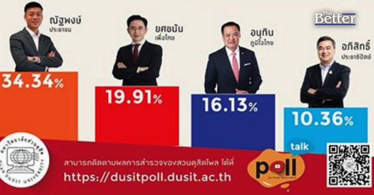 ส่วนพรรคเพื่อไทยมีความได้เปรียบ 1 นโยบาย คือด้านปากท้อง/ค่าครองชีพ ร้อยละ 35.63 ทั้งนี้ถ้ามีการเลือกตั้ง กลุ่มตัวอย่างจะเลือกพรรคประชาชน ร้อยละ 34.11รองลงมาคือ เพื่อไทย ร้อยละ 18.37 และเลือก สส.เขตสังกัดพรรคประชาชน ร้อยละ 33.14 รองลงมาคือ เพื่อไทย ร้อยละ19.49 โดยบุคคลที่อยากให้เป็นนายกรัฐมนตรีคนต่อไป คือ ณัฐพงษ์ (ปชน.) ร้อยละ 34.34 ยศชนัน (พท.) ร้อยละ 19.91และอนุทิน (ภท.) ร้อยละ 16.13