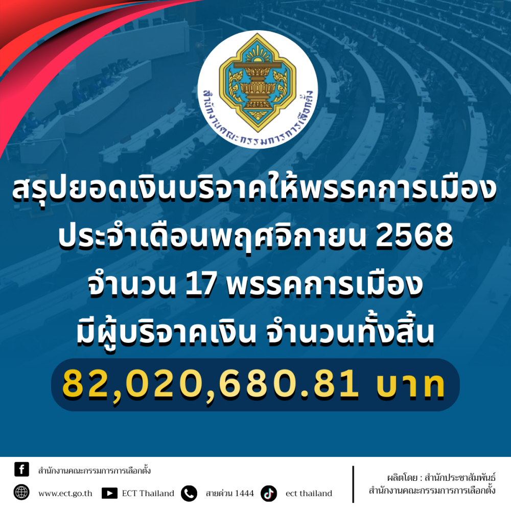 สำนักงานคณเะกรรมการการเลือกตั้ง หรือ กกต. เปิดเผยยอดเงินบริจาคให้กับพรรคการเมืองประจำเดือนพฤศจิกายน 2568 จำนวน 17 พรรคการเมือง โดยมีผู้บริจาคเงินให้พรรคการเมืองที่มีจำนวนเงินตั้งแต่ 5,000 บาทขึ้นไปจำนวน 222 ราย เป็นเงินทั้งสิ้น 82,020,680.81 บาท