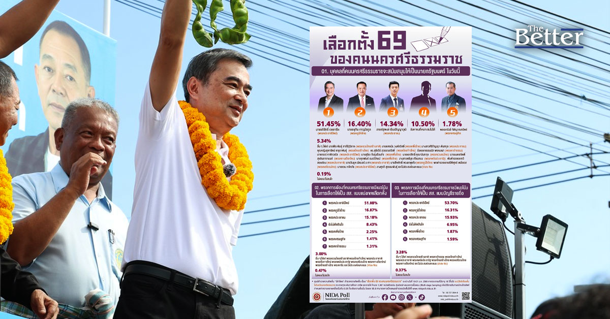 นิด้าโพล เผย เลือกตั้ง69 คนนครศรีธรรมราช เลือก "อภิสิทธิ์ " เป็นนายกฯ กา ส.ส.พรรคประชาชน ทั้ง 2 ใบ "อนุทิน-ภูมิใจไทย" ตามที่ 2