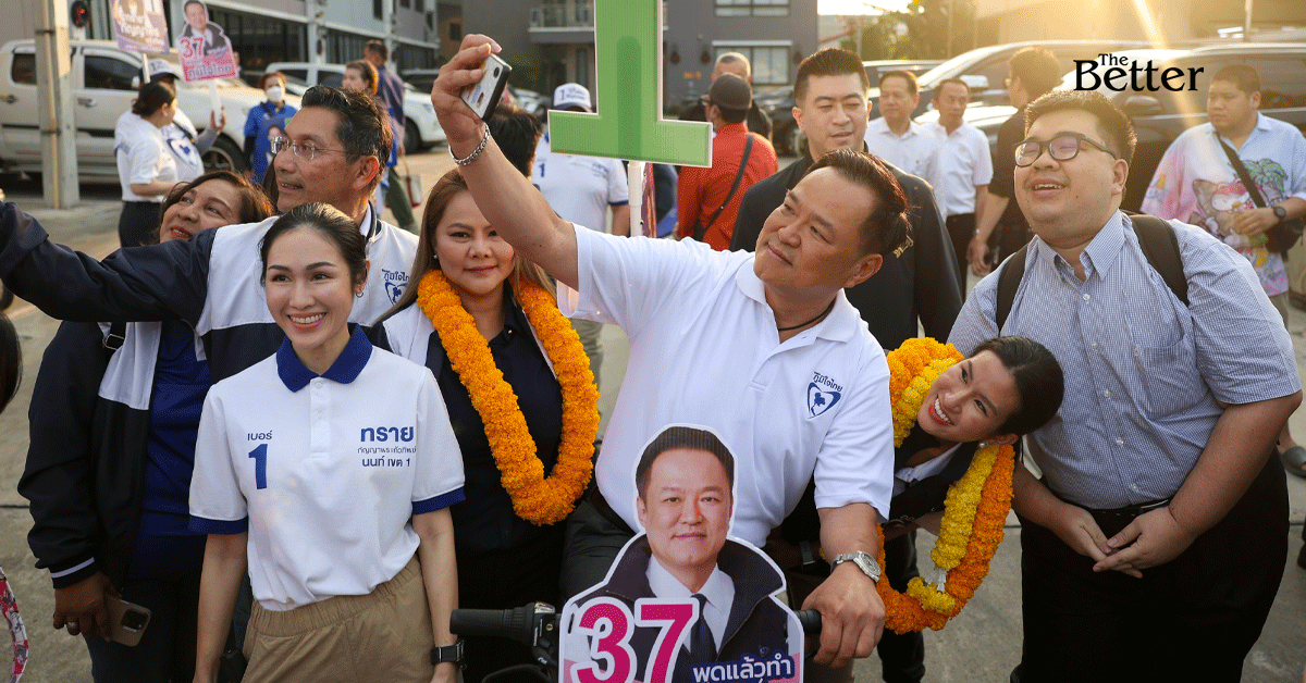 "อนุทิน" ลงพื้นที่ช่วยผู้สมัคร สส.นนทบุรี เขต 1 ปั่นจักรยานหาเสียงตลาดพระนั่งเกล้า ยิ้มรับแม่ค้าทักผิดเรียกชื่อ "ชินวัตร" บอกเป็นมงคล ยัน "คนละครึ่งพลัส" มาแน่ เจอแฟนคลับรุมกอด-ขอเพิ่มเบี้ยผู้สูงอายุ