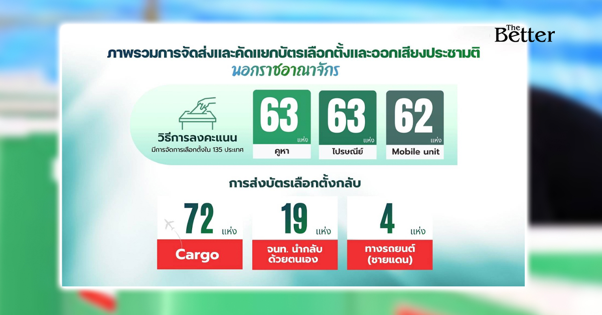 ทั้งนี้ กระทรวงการต่างประเทศและกรมการกงสุลระบุว่า ข้อมูลทั้งหมดเป็นสถานะอย่างไม่เป็นทางการ และอยู่ระหว่างการเร่งประสานงานกับทุกหน่วยงานที่เกี่ยวข้อง เพื่อให้บัตรเลือกตั้งทุกใบส่งถึงประเทศไทยภายในกรอบเวลาที่กำหนด เพื่อเข้าสู่กระบวนการนับคะแนนอย่างเป็นทางการต่อไป