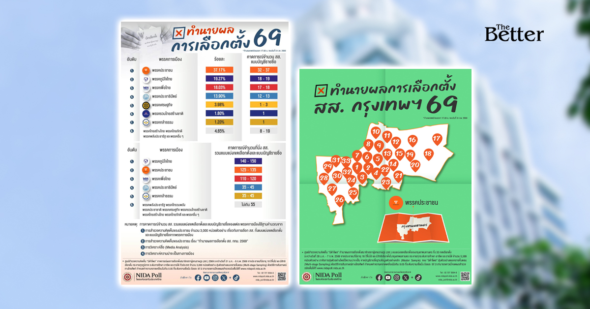 “นิด้าโพล”คาดเลือกตั้ง 69"ปชน."ครองใจคนเมือง กวาด ส.ส. กทม. ยกแผง 33 เขต ภาพรวมทั้งประเทศ “ภท.” มาแรงจ่อคว้า ส.ส. สูงสุด 140–150 ที่นั่ง ด้านประชามติแก้ระน.เสียงส่วนใหญ่หนุน “เห็นชอบ” เกินครึ่ง