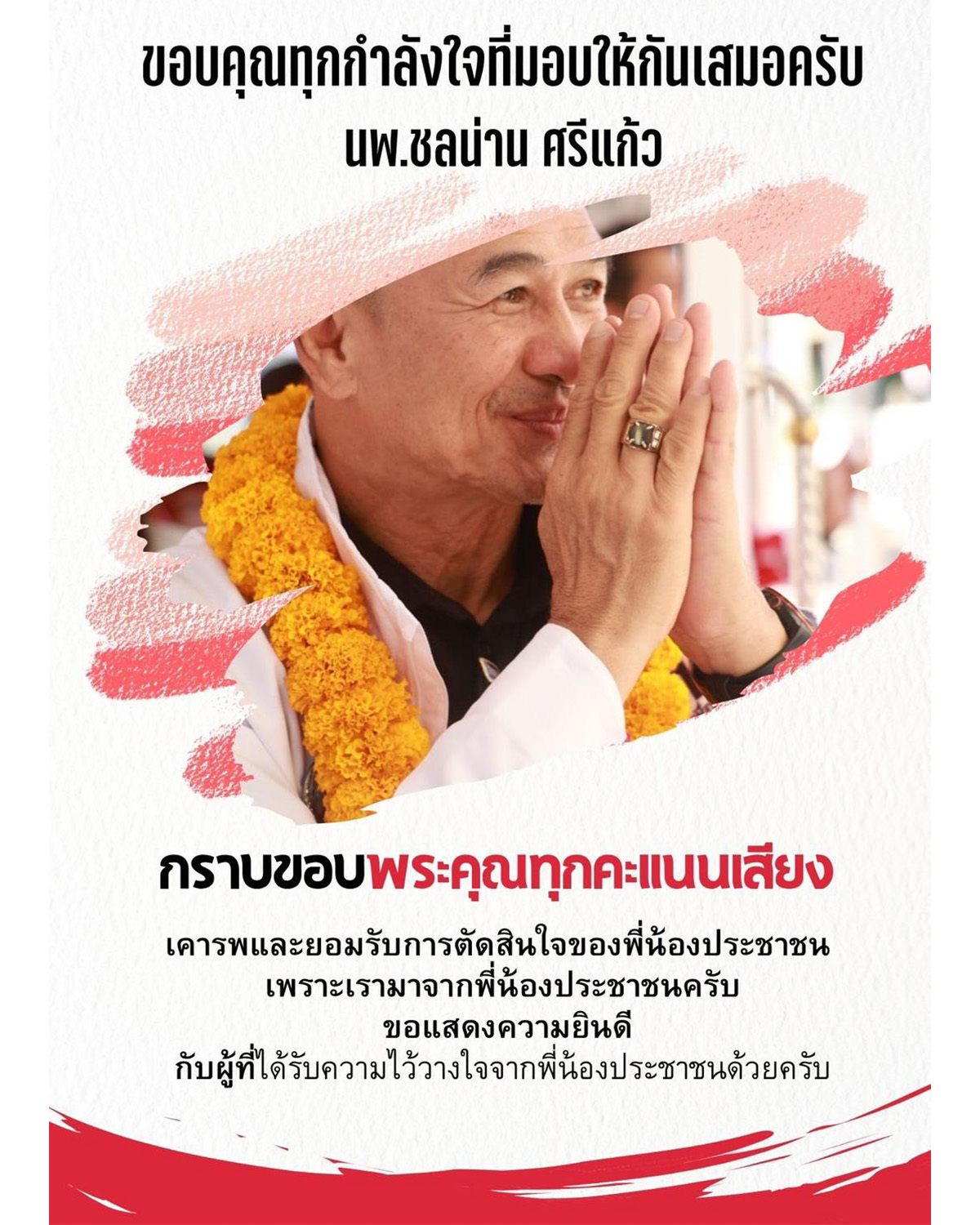 นายแพทย์ชลน่าน ศรีแก้ว ผู้สมัคร สส.เขต 2 จังหวัดน่าน สังกัดพรรคเพื่อไทย โพสต์ข้อความผ่านเฟซบุ๊ก ภายหลังผลการเลือกตั้ง อย่างไม่เป็นทางการ ในพื้นที่เขต 2 จังหวัดน่าน พบคะแนนอันดับ 1 คือ นายประสิทธิ์ โนทะ ผู้สมัครพรรคกล้าธรรม โดยระบุว่า "กราบขอบพระคุณทุกคะแนนเสียง เคารพและยอมรับการตัดสินใจของพี่น้องประชาชน เพราะเรามาจากพี่น้องประชาชนครับ ขอแสดงความยินดีกับผู้ที่ได้รับความไว้วางใจจากพี่น้องประชาชนด้วยครับ"