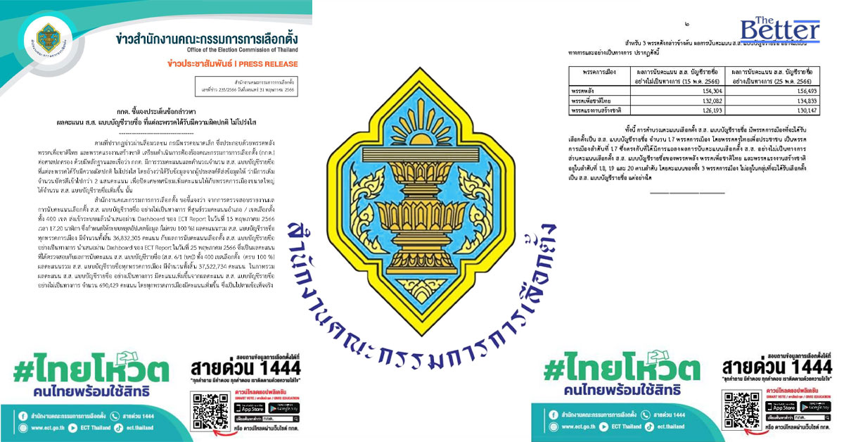 กกต. ขอชี้แจงว่า จากการตรวจสอบรายงานผลการนับคะแนนเลือกตั้ง ส.ส.แบบบัญชีรายชื่อ อย่างไม่เป็นทางการ ที่ศูนย์รวมคะแนนอำเภอ/เขตเลือกตั้งทั้ง 400 เขต ส่งเข้าระบบแล้วนำเสนอผ่าน Dashboard ของ ECT Report ในวันที่ 15 พ.ค.2566 เวลา 17.20 น. ซึ่งกำหนดให้ระบบหยุดอัปเดตข้อมูล (ไม่ครบ100%) ผลคะแนนรวม ส.ส.แบบบัญชีรายชื่อ ทุกพรรคการเมือง มีจำนวนทั้งสิ้น 36,832,305 คะแนน กับผลการนับคะแนนเลือกตั้ง ส.ส.แบบบัญชีรายชื่ออย่างเป็นทางการ นำเสนอผ่าน Dashboard ของ ECT Report ในวันที่ 25พ.ค. 2566 ซึ่งเป็นผลคะแนนที่ได้ตรวจสอบกับผลการนับคะแนน ส.ส.แบบบัญชีรายชื่อ (ส.ส.6/1(บช.))ทั้ง 400เขตเลือกตั้ง (ครบ 100%) ผลคะแนนรวมส.ส.แบบบัญชีรายชื่อทุกพรรคการเมืองมีจำนวนทั้งสิ้น 37,522,734 คะแนน ในภาพรวมผลคะแนนส.ส.แบบบัญชีรายชื่ออย่างเป็นทางการ มีคะแนนเพิ่มขึ้น จากผลคะแนน ส.ส.แบบบัญชีรายชื่ออย่างไม่เป็นทางการ จำนวน 690,429 คะแนน โดยทุกพรรคการเมืองมีคะแนนเพิ่มขึ้น ซึ่งเป็นไปตามข้อเท็จจริง