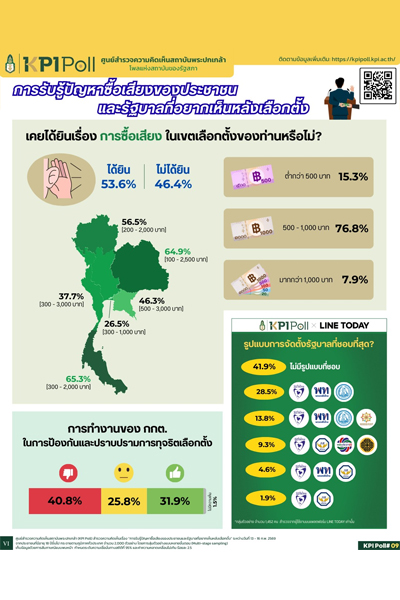 ศูนย์สำรวจความคิดเห็นสถาบันพระปกเกล้า (KPI Poll) เปิดเผยสำรวจความคิดเห็นเรื่อง “การรับรู้ปัญหาซื้อเสียงของประชาชนและรัฐบาลที่อยากเห็นหลังเลือกตั้ง” พบว่า มีข้อมูลที่น่าสนใจในหลายประเด็น ดังนี้