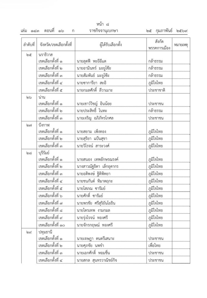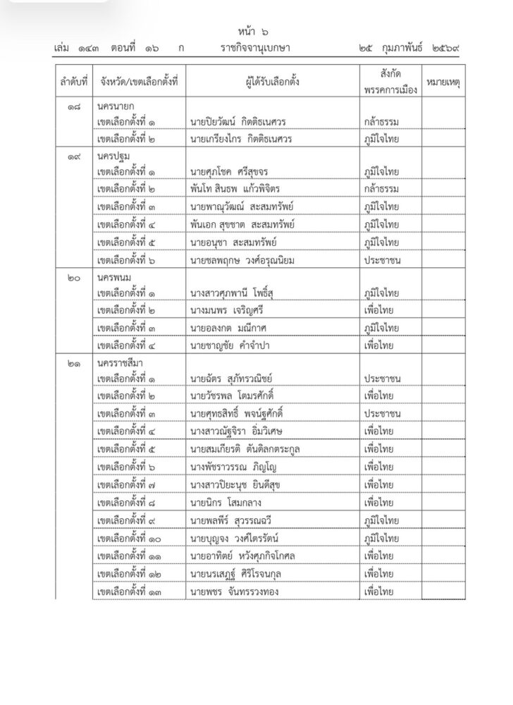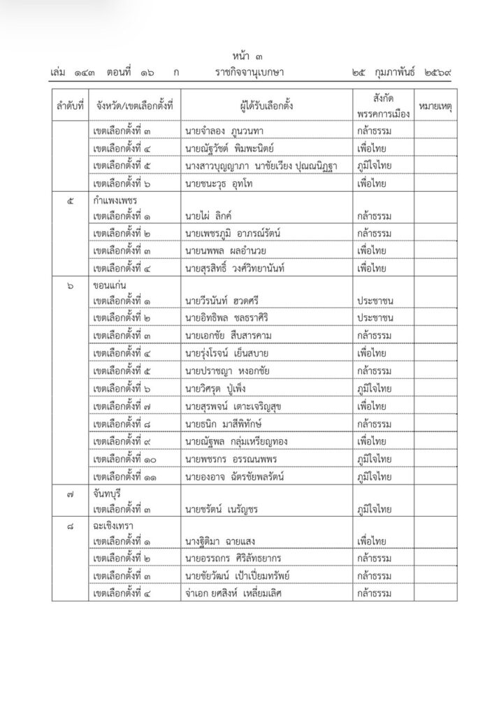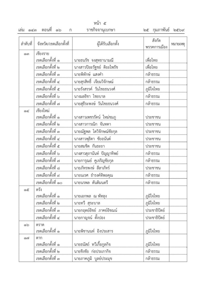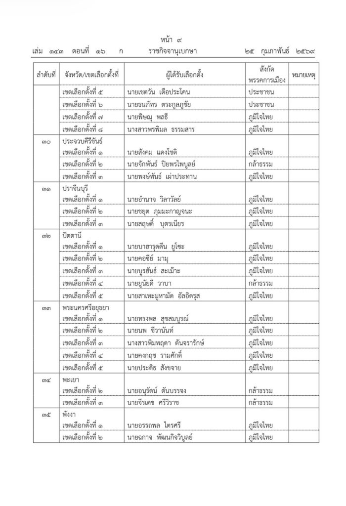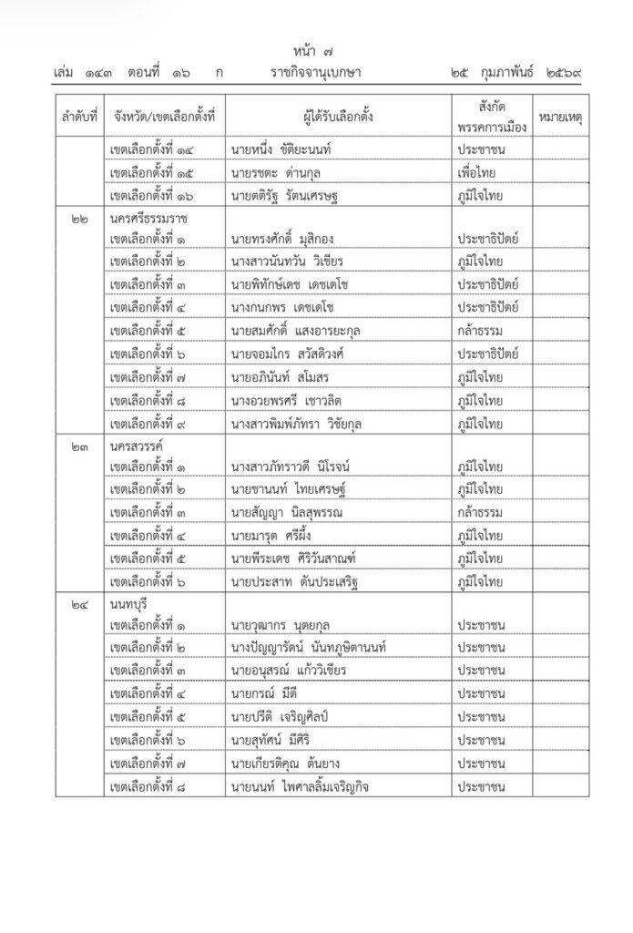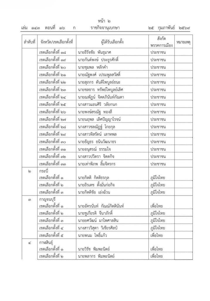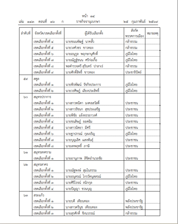 ราชกิจจานุเบกษา เผยแพร่ประกาศ กกต. รับรองผลการเลือกตั้ง สส. 396 คน