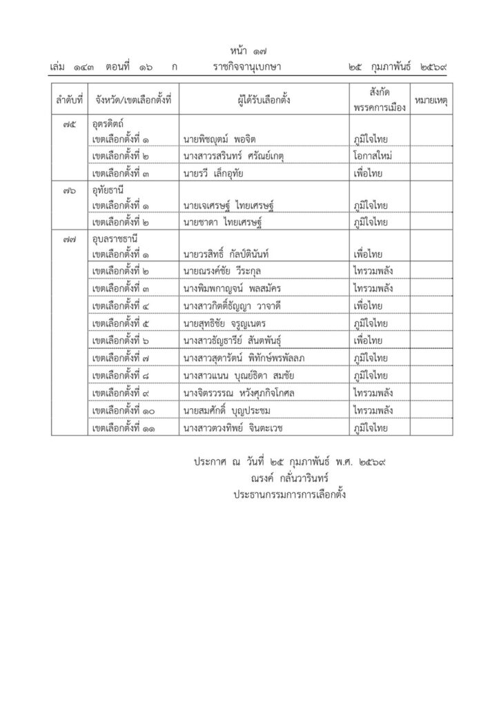 ที่เว็บไซต์ ราชกิจจานุเบกษา เผยแพร่ประกาศคณะกรรมการการเลือกตั้ง (กกต.) เรื่อง ผลการเลือกตั้งสมาชิกสภาผู้แทนราษฎรแบบแบ่งเขตเลือกตั้ง โดยระบุว่า
