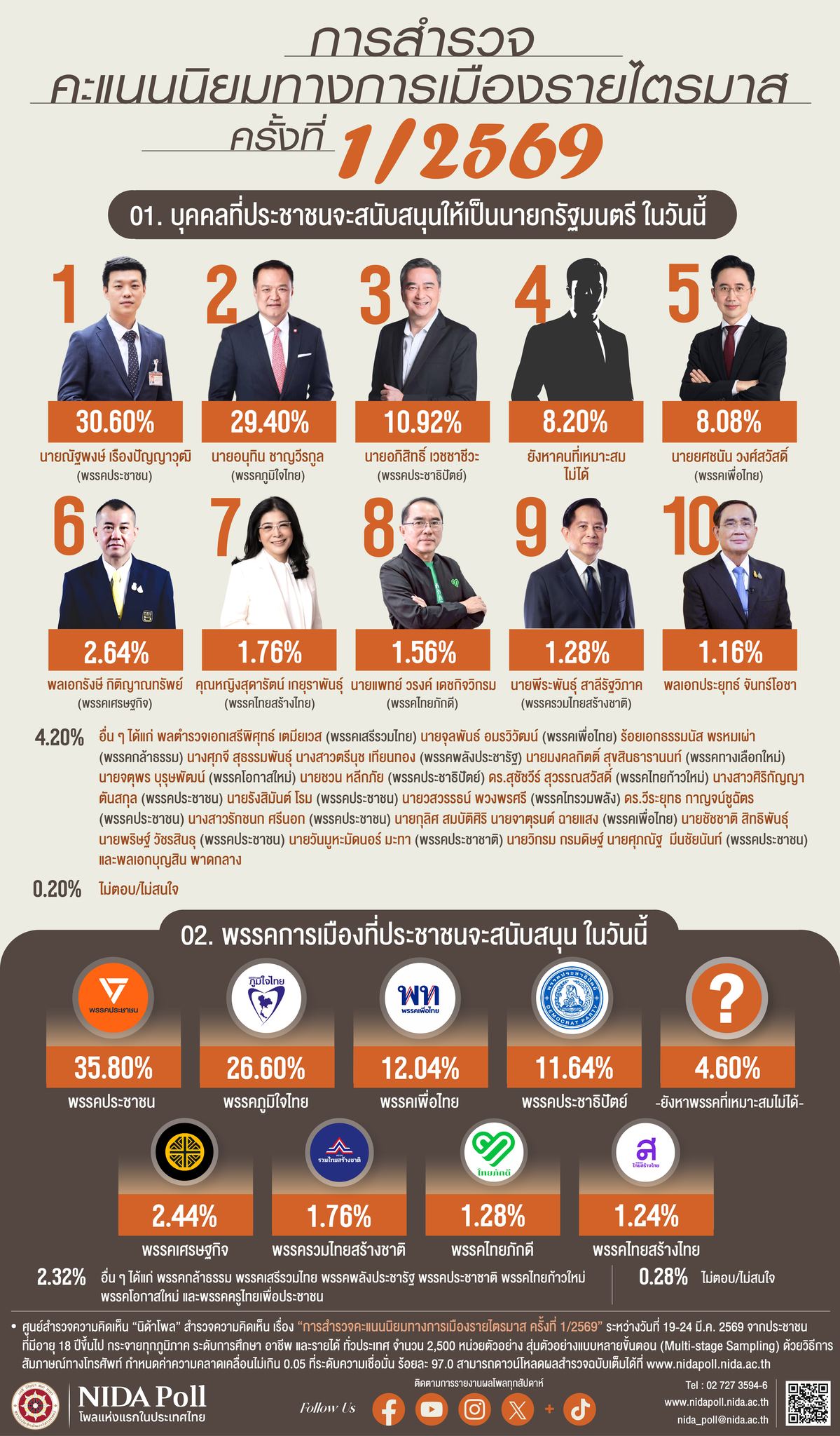 ศูนย์สำรวจความคิดเห็น “นิด้าโพล” สถาบันบัณฑิตพัฒนบริหารศาสตร์ (นิด้า) เปิดเผยผลการสำรวจ เรื่อง “การสำรวจคะแนนนิยมทางการเมืองรายไตรมาส ครั้งที่ 1/2569” ทำการสำรวจระหว่างวันที่ 19-24 มีนาคม 2569 จากประชาชนที่มีอายุ 18 ปีขึ้นไป กระจายทุกภูมิภาค ระดับการศึกษา อาชีพ และรายได้ ทั่วประเทศ รวมจำนวนทั้งสิ้น 2,500 หน่วยตัวอย่าง เกี่ยวกับคะแนนนิยมทางการเมือง การสำรวจอาศัยการสุ่มตัวอย่างโดยใช้ความน่าจะเป็น จากบัญชีรายชื่อฐานข้อมูลตัวอย่างหลัก (Master Sample) ของ “นิด้าโพล” สุ่มตัวอย่างแบบหลายขั้นตอน (Multi-stage Sampling) เก็บข้อมูลด้วยวิธีการสัมภาษณ์ทางโทรศัพท์ โดยกำหนดค่าความคลาดเคลื่อนไม่เกิน 0.05 ที่ระดับความเชื่อมั่น ร้อยละ 97.0