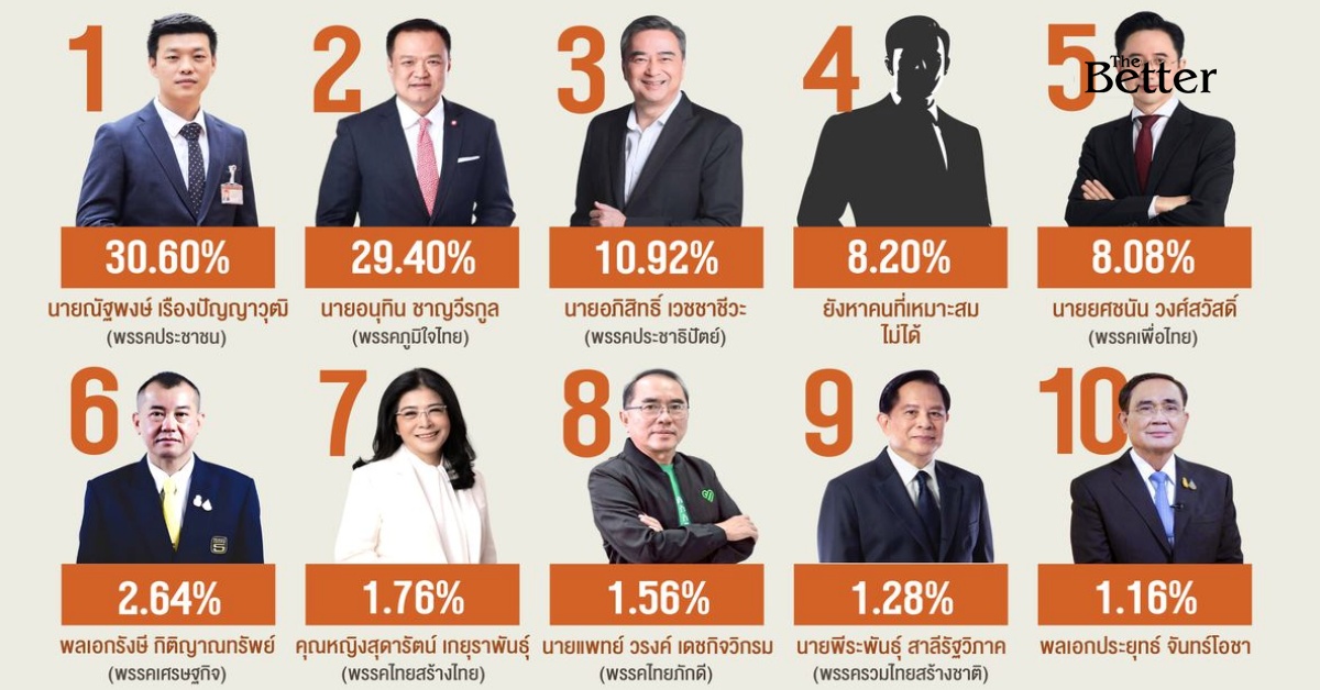 นายวสวรรธน์ พวงพรศรี (พรรคไทรวมพลัง) ดร.วีระยุทธ กาญจน์ชูฉัตร (พรรคประชาชน) นางสาวรักชนก ศรีนอก (พรรคประชาชน) นายกุลิศ สมบัติศิริ นายจาตุรนต์ ฉายแสง (พรรคเพื่อไทย) นายชัชชาติ สิทธิพันธุ์ นายพริษฐ์ วัชรสินธุ (พรรคประชาชน) นายวันมูหะมัดนอร์ มะทา (พรรคประชาชาติ) นายวิกรม กรมดิษฐ์ นายศุภณัฐ มีนชัยนันท์ (พรรคประชาชน) และพลเอกบุญสิน พาดกลาง และร้อยละ 0.20 ระบุว่า ไม่ตอบ/ไม่สนใจ