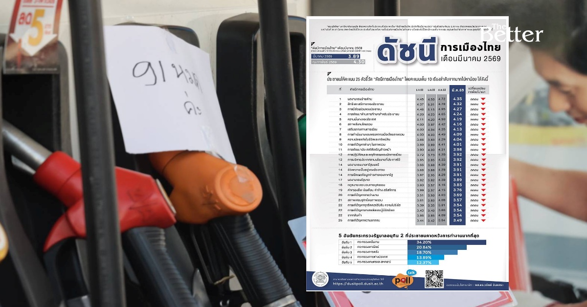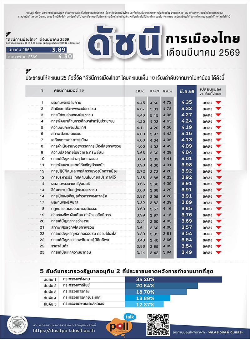 สวนดุสิตโพล มหาวิทยาลัยสวนดุสิต สำรวจความคิดเห็นประชาชนทั่วประเทศ เรื่อง “ดัชนีการเมืองไทยประจำเดือนมีนาคม 2569” กลุ่มตัวอย่าง จำนวน 2,181 คน (สำรวจทางออนไลน์และภาคสนาม) ระหว่างวันที่ 24-27 มีนาคม 2569 พบว่า กลุ่มตัวอย่างให้คะแนนภาพรวมดัชนีการเมืองไทยประจำเดือนมีนาคม เฉลี่ย 3.89 คะแนนลดลงจากเดือนกุมภาพันธ์ 2569 ที่ได้ 4.30 คะแนน ตัวชี้วัดที่ได้คะแนนสูงสุด คือ ผลงานของฝ่ายค้าน ได้คะแนนเฉลี่ย 4.35คะแนน ตัวชี้วัดที่ได้คะแนนต่ำสุด คือการแก้ปัญหาความยากจน ได้คะแนนเฉลี่ย 3.49 คะแนนทั้งนี้กระทรวงที่ประชาชนคาดหวังการทำงานมากที่สุด คือ กระทรวงพลังงาน ร้อยละ 34.20 รองลงมาคือ กระทรวงพาณิชย์ร้อยละ 20.84