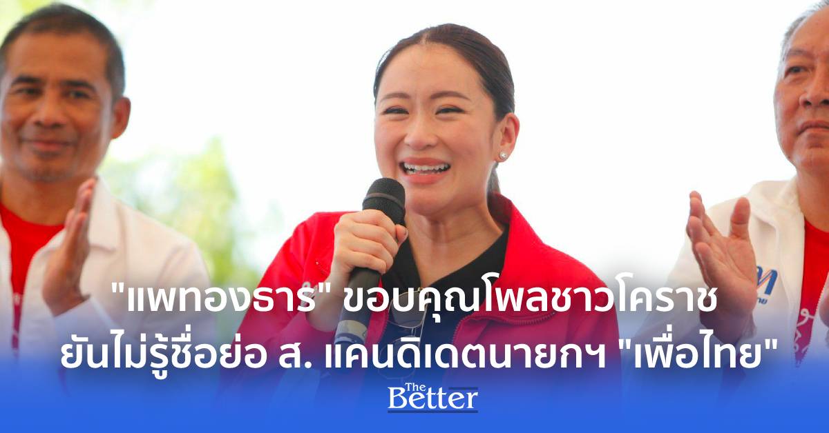 "แพทองธาร" ขอบคุณโพลชาวโคราช เลือกเป็นนายกฯ เผย "เพื่อไทย" มีนโยบายหวังยกระดับชีวิต ปชช. ทั่วประเทศ ยันไม่รู้มีชื่อย่อ ส. เป็นแคนดิเดตนายกฯเพื่อไทย