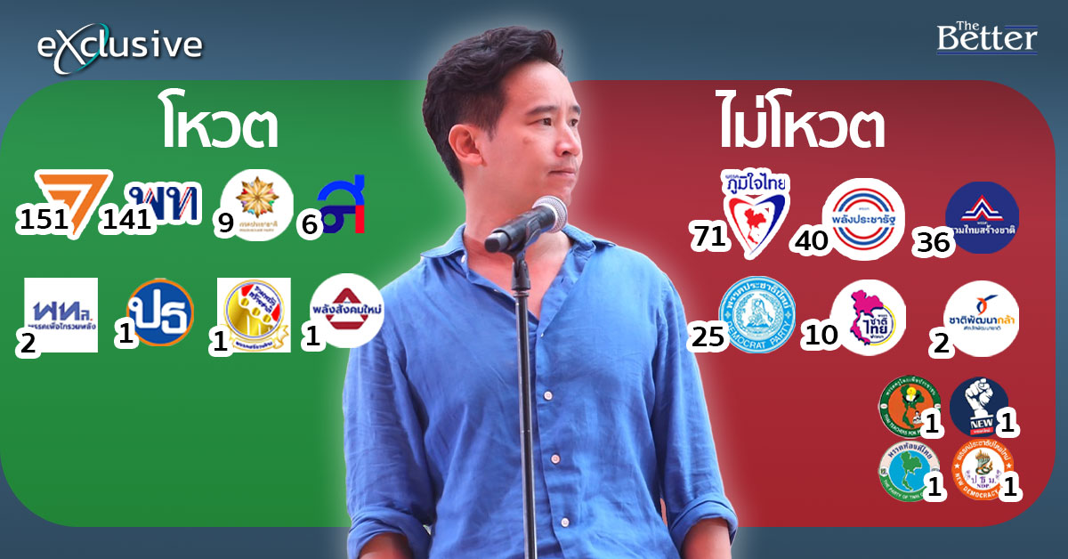 สำหรับเสียงในส่วนของฝั่งส.ส."พิธา" มีอยู่ 312 เสียง ประกอบด้วย พรรคก้าวไกล 151 พรรคเพื่อไทย 141 พรรคประชาชาติ 9 พรรคไทยสร้างไทย 6 พรรคเพื่อไทรวมพลัง 2 พรรคเป็นธรรม 1 พรรคเสรีรวมไทย 1 พรรคพลังสังคมใหม่ 1 ซึ่งทุกพรรคต่างยืนยันโหวตหนุน "พิธา" แต่ทว่าในทางปฏิบัติ ประธานสภาอาจจะต้องงดออกเสียงเพื่อแสดงความเป็นกลางทางการเมือง ซึ่งหาก นายวันมูหะมัดนอร์ มะทา ประธานรัฐสภา ต้องงดออกเสียงจะทำให้ เสียงรัฐบาลลดเหลือ 311 เสียง ก็จะต้องไปหาเสียงเพิ่มอีกจากส.ว.คือต้องได้ 65 เสียง