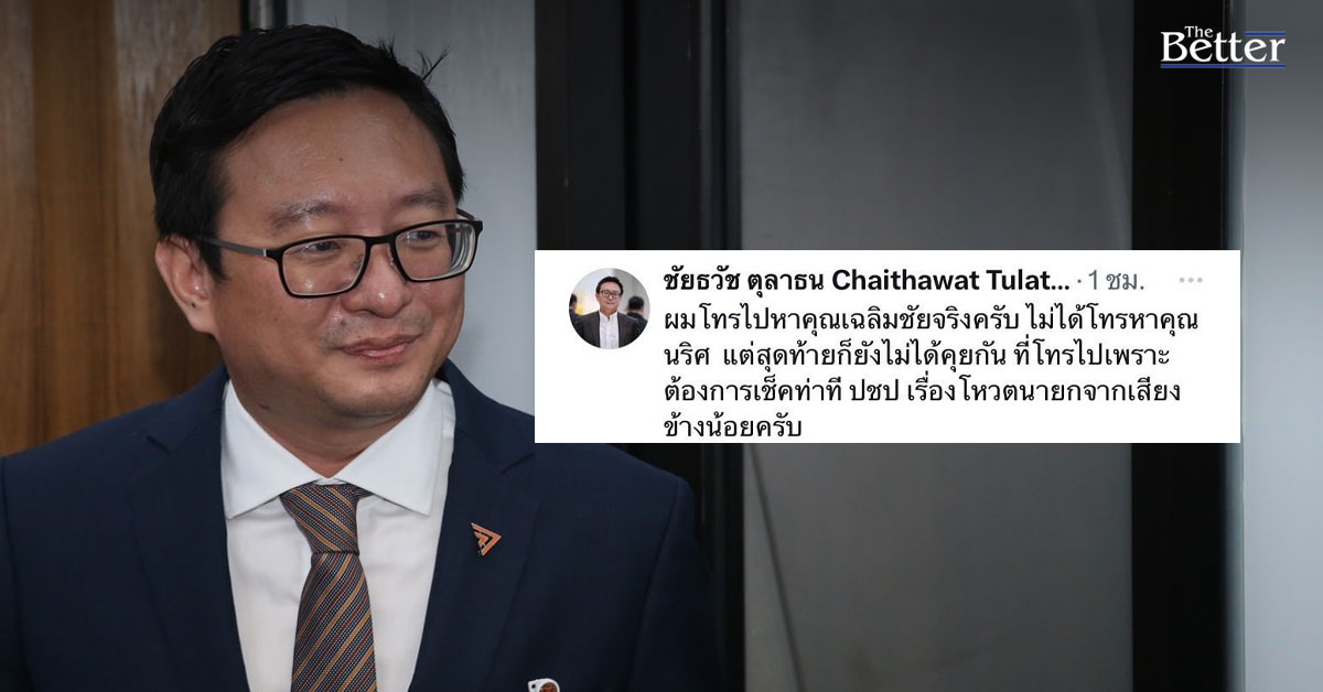นายชัยธวัช ตุลาธน เลขาธิการพรรคก้าวไกล โพสต์ข้อความผ่านทวิตเตอร์ โดยยอมรับว่า โทรติดต่อนายเฉลิมชัยจริง แต่สุดท้ายยังไม่ได้คุยกัน ที่โทรไปเพราะต้องการเช็กท่าทีของพรรคประชาธิปัตย์ เรื่องโหวตนายกฯ จากเสียงข้างน้อย