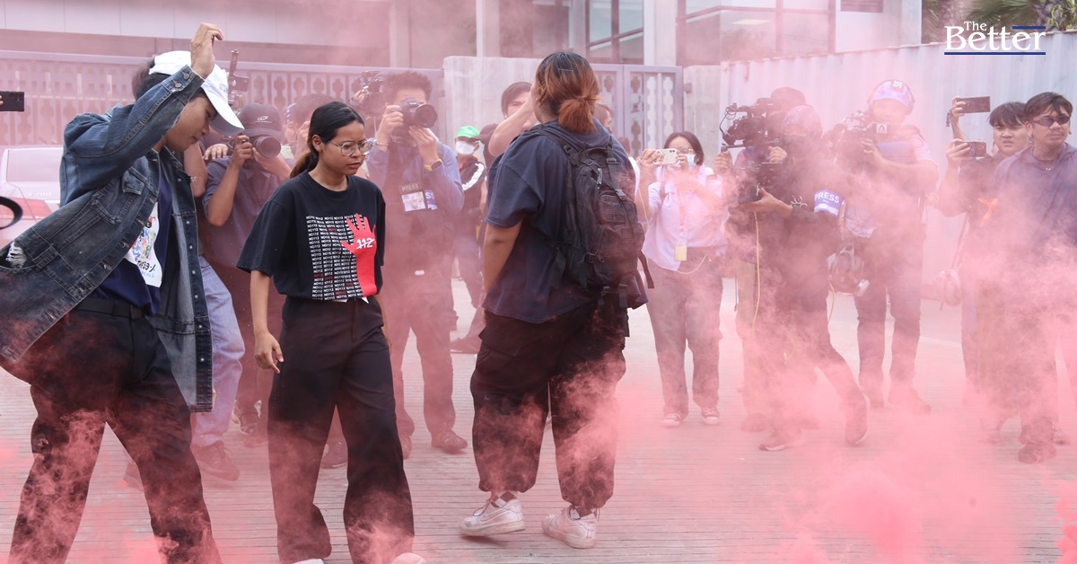 เมื่อช่วงบ่าย ที่หน้าประตูทางเข้า อาคารรัฐสภา ฝั่งถนนทหาร กลุ่มโมกหลวงริมน้ำและกลุ่มทะลุแก๊สจุดพลุสีส้มเพื่อเป็นการแสดงออกเชิงสัญลักษณ์ ประท้วงไม่พอใจคำวินิจฉัยของศาลรัฐธรรมนูญที่ให้นายพิธา ลิ้มเจริญรัตน์ หัวหน้าและแคดิเดตนายกฯของพรรคก้าวไกล หยุดปฏิบัติหน้าที่ส.ส