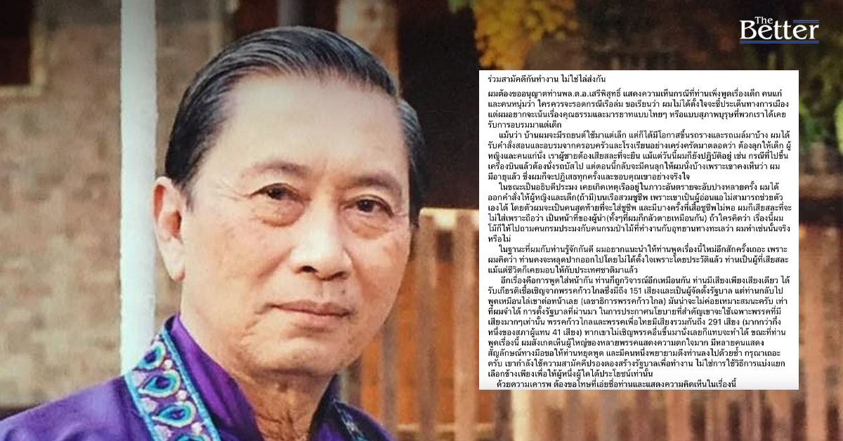 วันที่ 22 ก.ค. 2566 นายปลอดประสพ สุรัสวดี อดีตรองนายกรัฐมนตรีและแกนนำพรรคเพื่อไทย โพสต์เฟซบุ๊กระบุข้อความถึงพล.ต.อ.เสรีพิสุทธิ์ หัวหน้าพรรคเสรีรวมไทยว่า ร่วมสามัคคีกันทำงาน ไม่ใช่ไล่ส่งกัน ผมต้องขออนุญาตท่านพล.ต.อ.เสรีพิสุทธิ์ แสดงความเห็นกรณีที่ท่านเพิ่งพูดเรื่องเด็ก คนแก่ และคนหนุ่มว่า ใครควรจะรอดกรณีเรือล่ม ขอเรียนว่า ผมไม่ได้ตั้งใจจะชี้ประเด็นทางการเมือง แต่ผมอยากจะเน้นเรื่องคุณธรรมและมารยาทแบบไทยๆ หรือแบบสุภาพบุรุษที่พวกเราได้เคยรับการอบรมมาแต่เด็ก