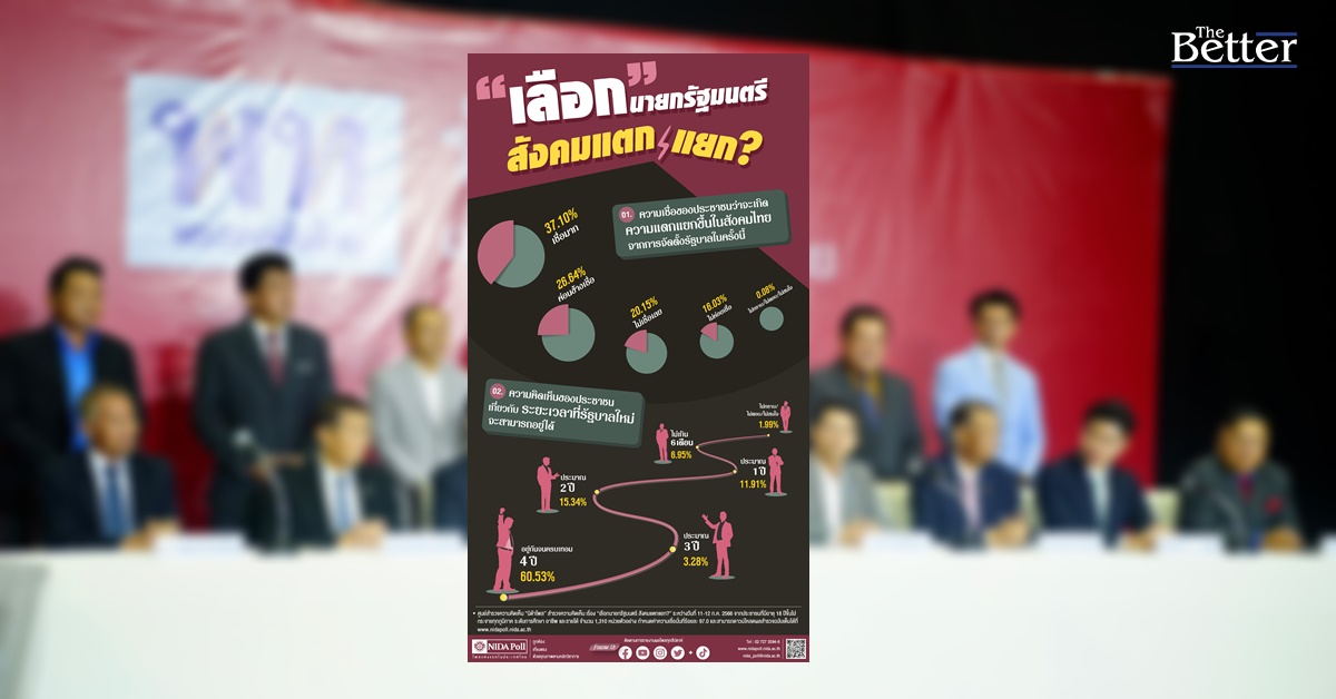 นิด้าโพล เผยผลสำรวจ ฟันธง "จัดตั้งรัฐบาล"ทำสังคมแตกแยก ขณะที่ ร้อยละ 60.53 มอง รัฐบาลใหม่อยู่ครบ 4 ปี