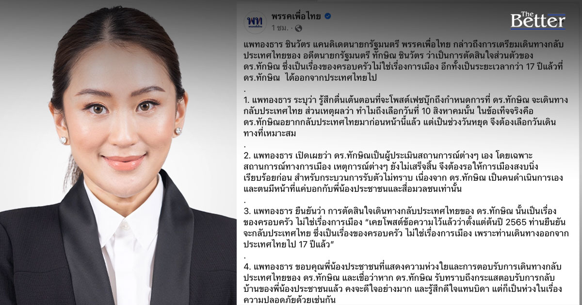 3. แพทองธาร ยืนยันว่า การตัดสินใจเดินทางกลับประเทศไทยของ ดร.ทักษิณ นั้นเป็นเรื่องของครอบครัว ไม่ใช่เรื่องการเมือง “เคยโพสต์ข้อความไว้แล้วว่าตั้งแต่ต้นปี 2565 ท่านยืนยันจะกลับประเทศไทย ซึ่งเป็นเรื่องของครอบครัว ไม่ใช่เรื่องการเมือง เพราะท่านเดินทางออกจากประเทศไทยไป 17 ปีแล้ว”